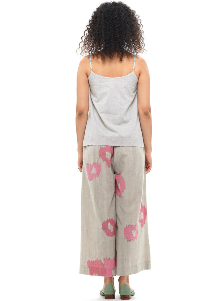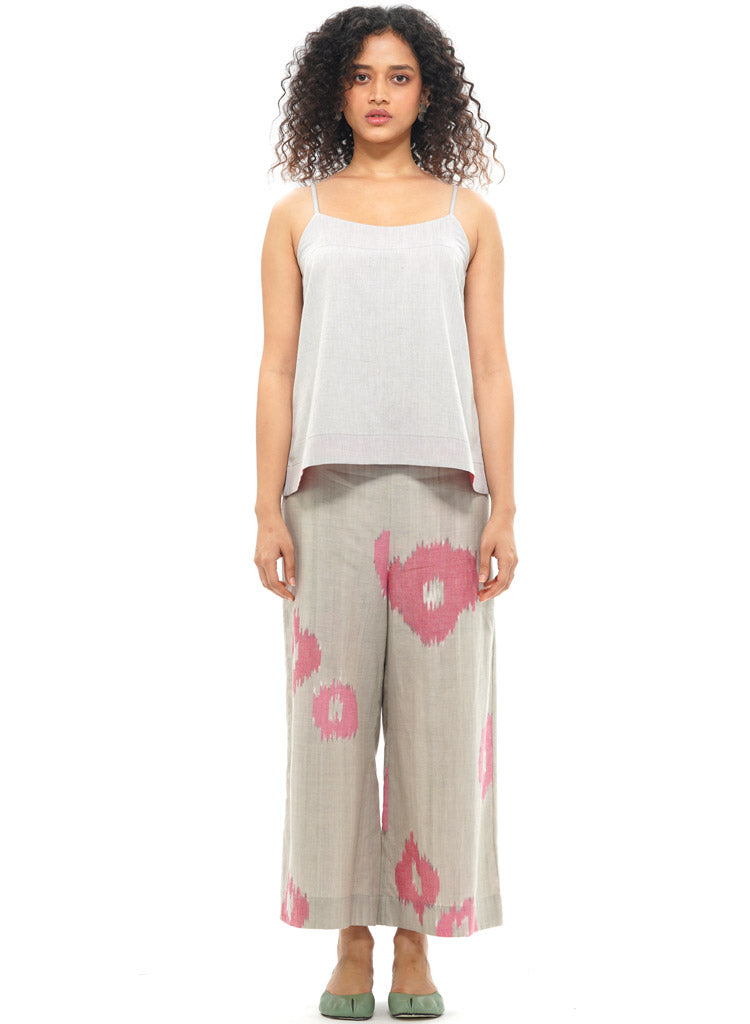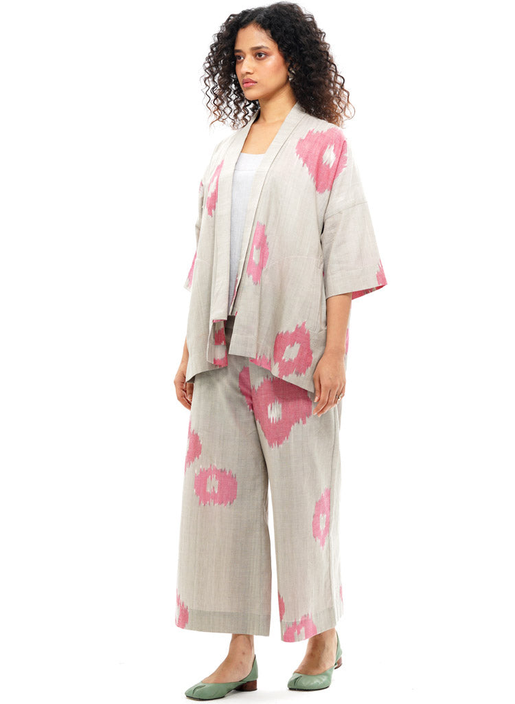 A three-piece set pairing the Shiro Slip Top, Yuri Kimono and the Yuri Palazzo. The strappy top with adjustable straps is perfect for a relaxed summer look. Length 23"- 24". The kimono features pockets on both sides, side slits and kimono sleeves. Bust 54", Length 27.5". The cropped palazzo with an adjustable drawstring and an elasticated back waist belt feature side pockets. Length 35"- 37.5".
