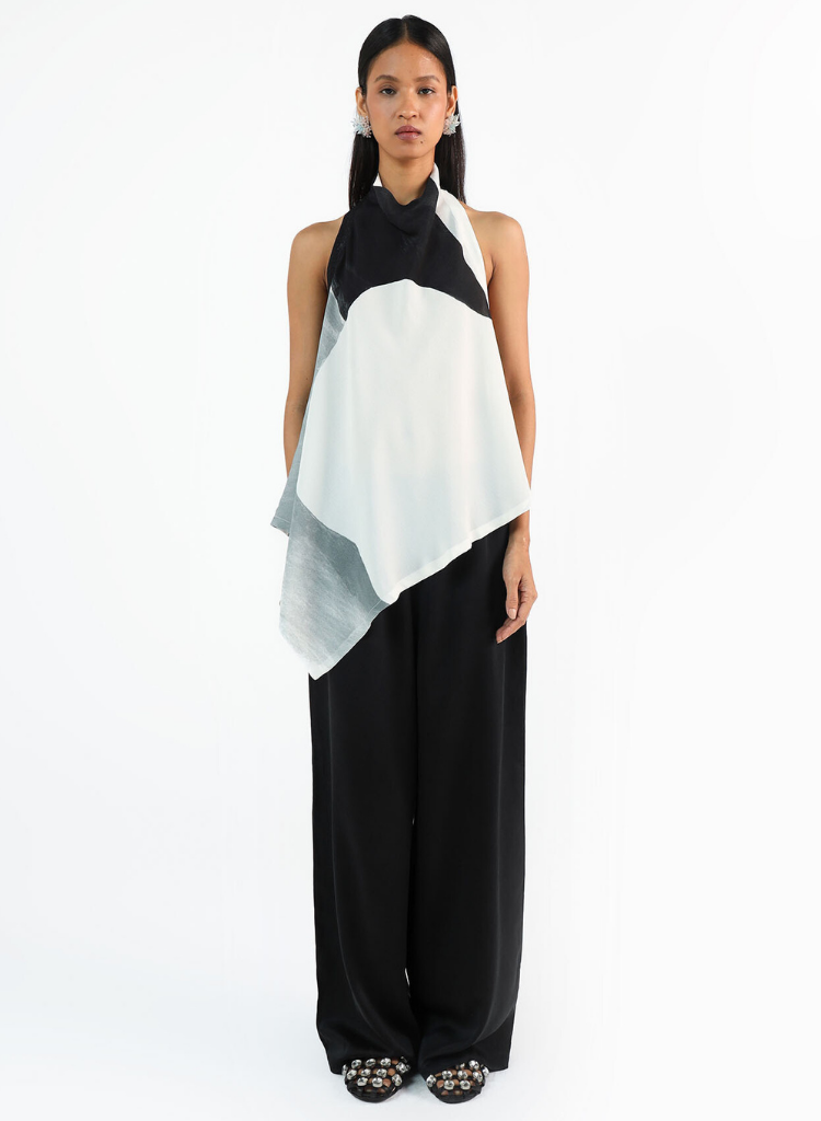 Hand-painted in a bold black-and-white abstract print, this halter-neck top falls in a relaxed silhouette with a low back and tie detail. Length 33.5" . The model is 5'8", and is wearing size S.