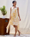 A slip dress with an asymmetric hem featuring a V-neck and noodle straps. Length 38.25-39.5" based on size. The model is 5'5" and is wearing size M.