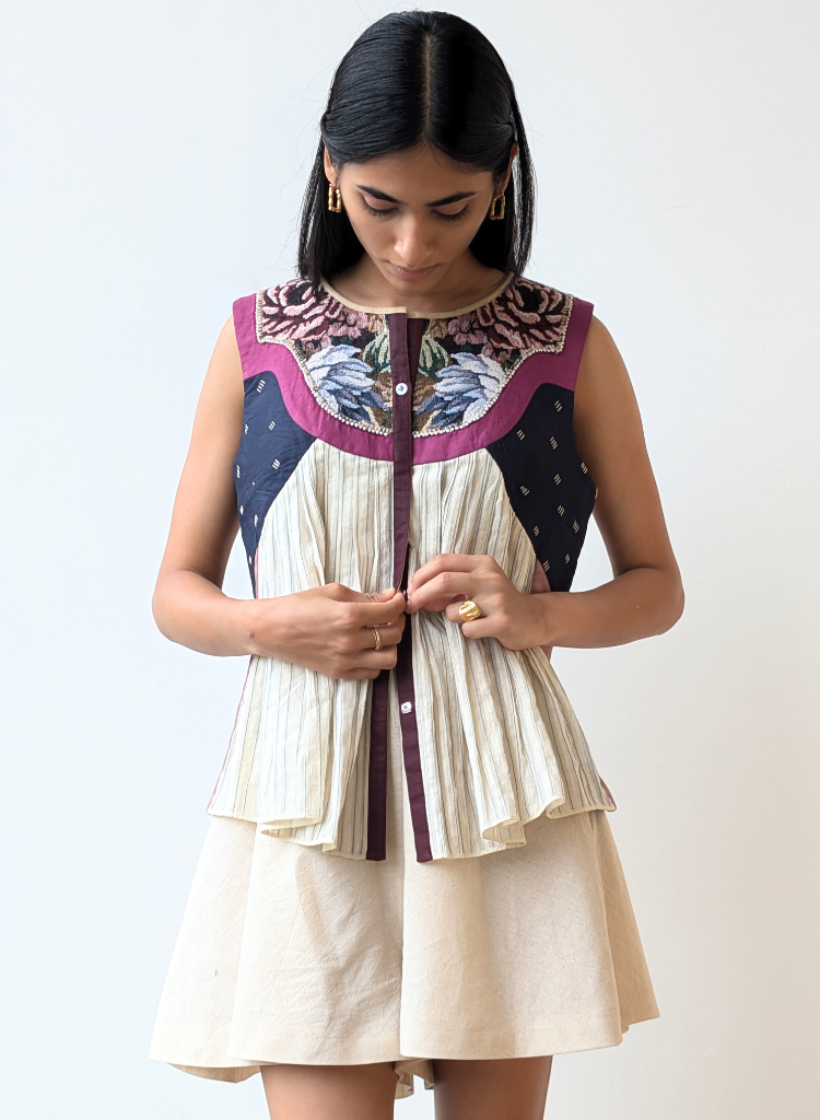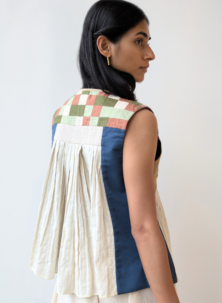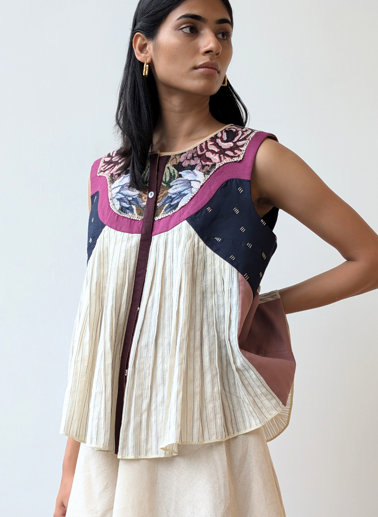 A sleeveless reversible top offering two striking looks: one side features a floral side with pearl beads embroidered across the yoke, accented by pleats with a coloured thread running through the warp. Flip to the other side for a contemporary feel, with a geometric collage of fabric squares. The model is 5'8" and is wearing size XS.
