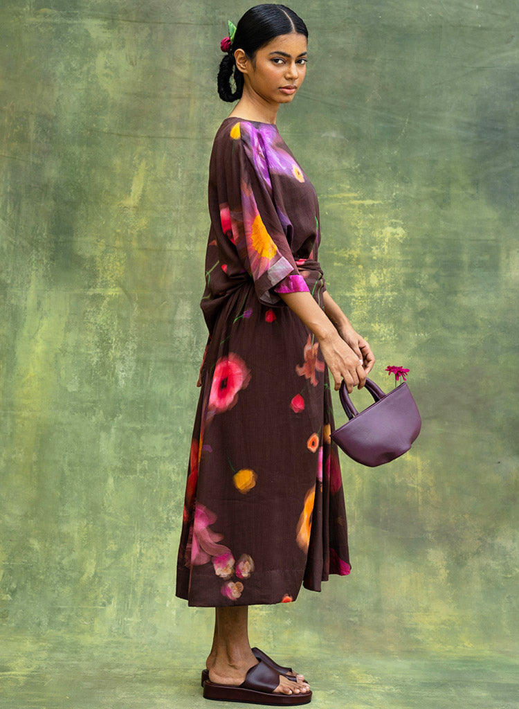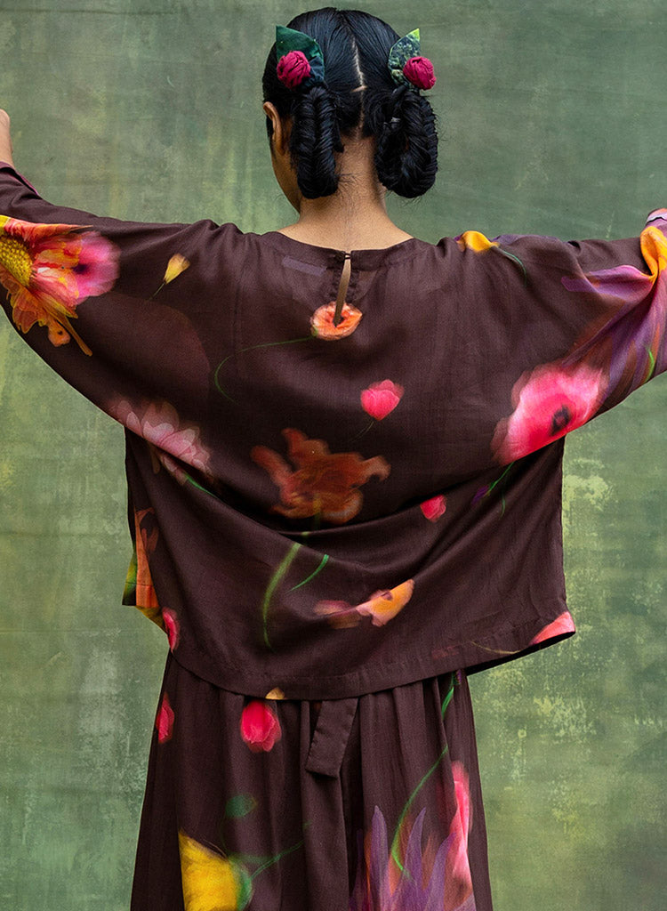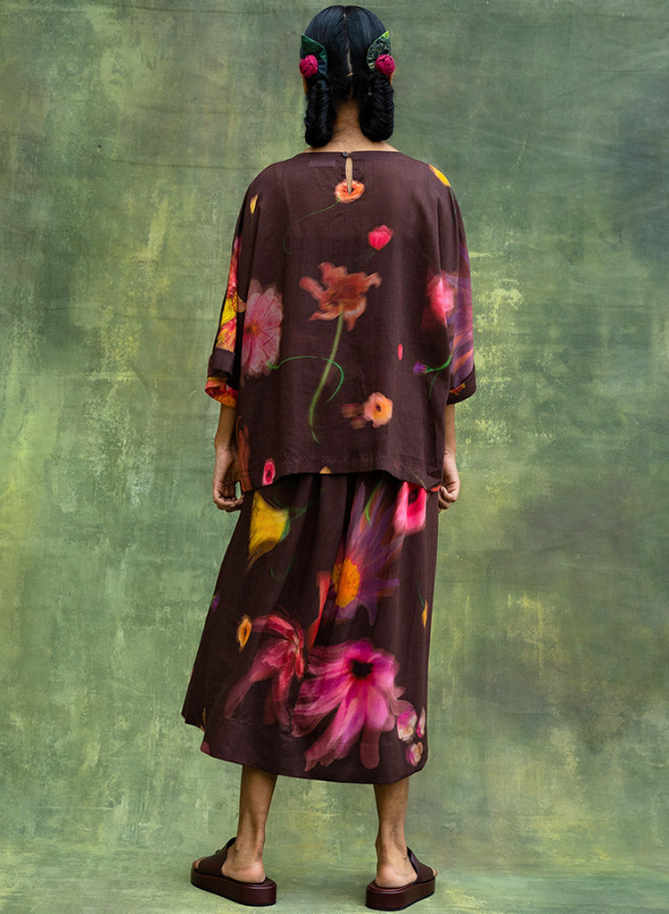 An oversized floral printed top featuring a round neck and kimono sleeves. Length 22". The model is 5'6" and is wearing a free size.