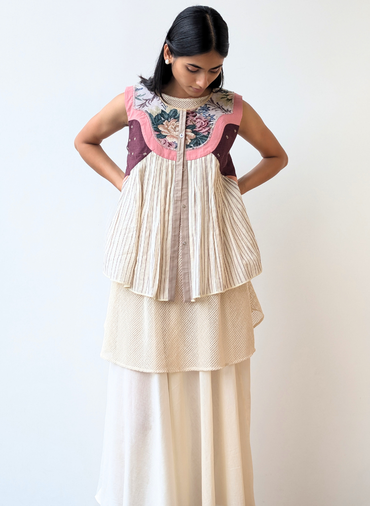 A sleeveless reversible top offering two striking looks: one side features a floral side with pearl beads embroidered across the yoke, accented by pleats with a coloured thread running through the warp. Flip to the other side for a contemporary feel, with a geometric collage of fabric squares. The model is 5'8" and is wearing size XS.