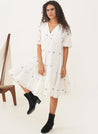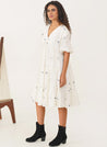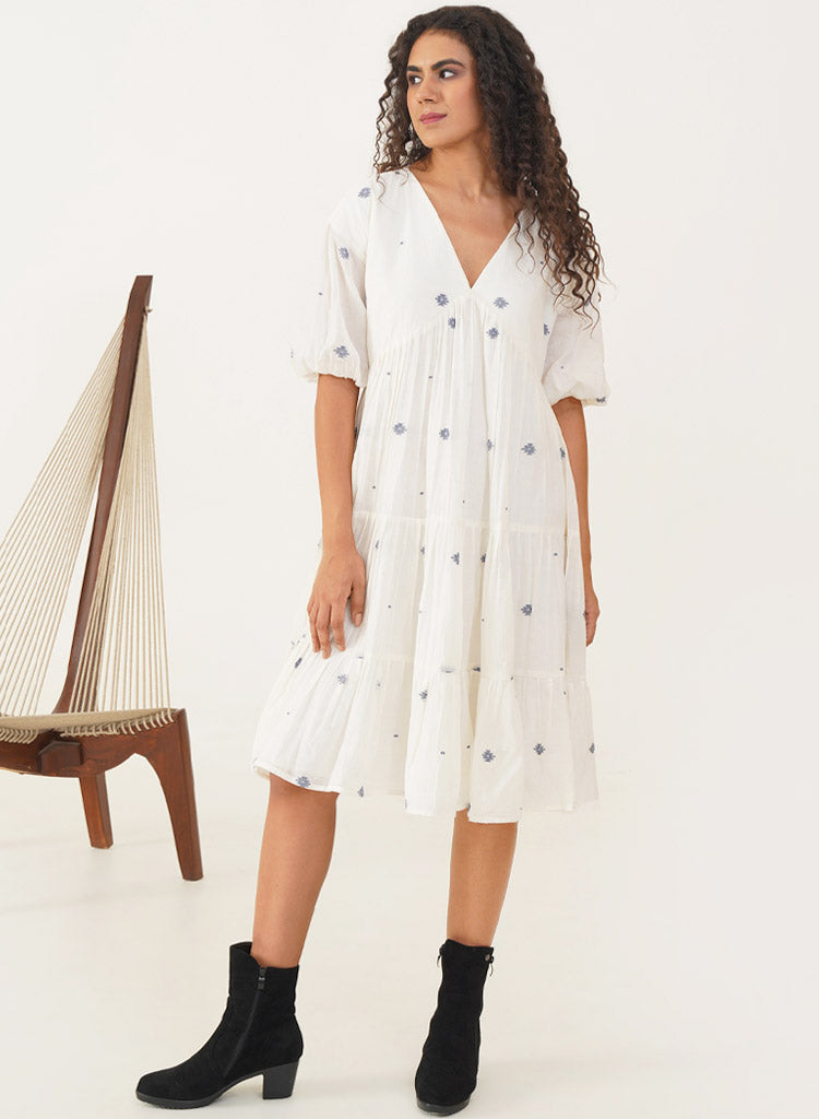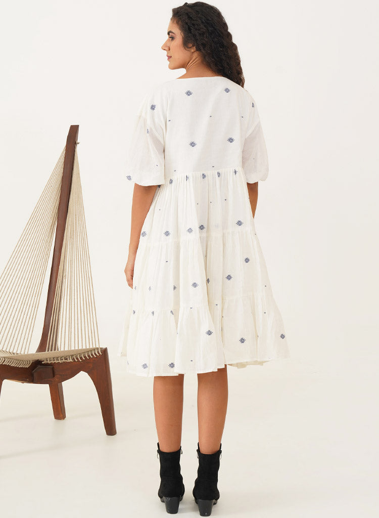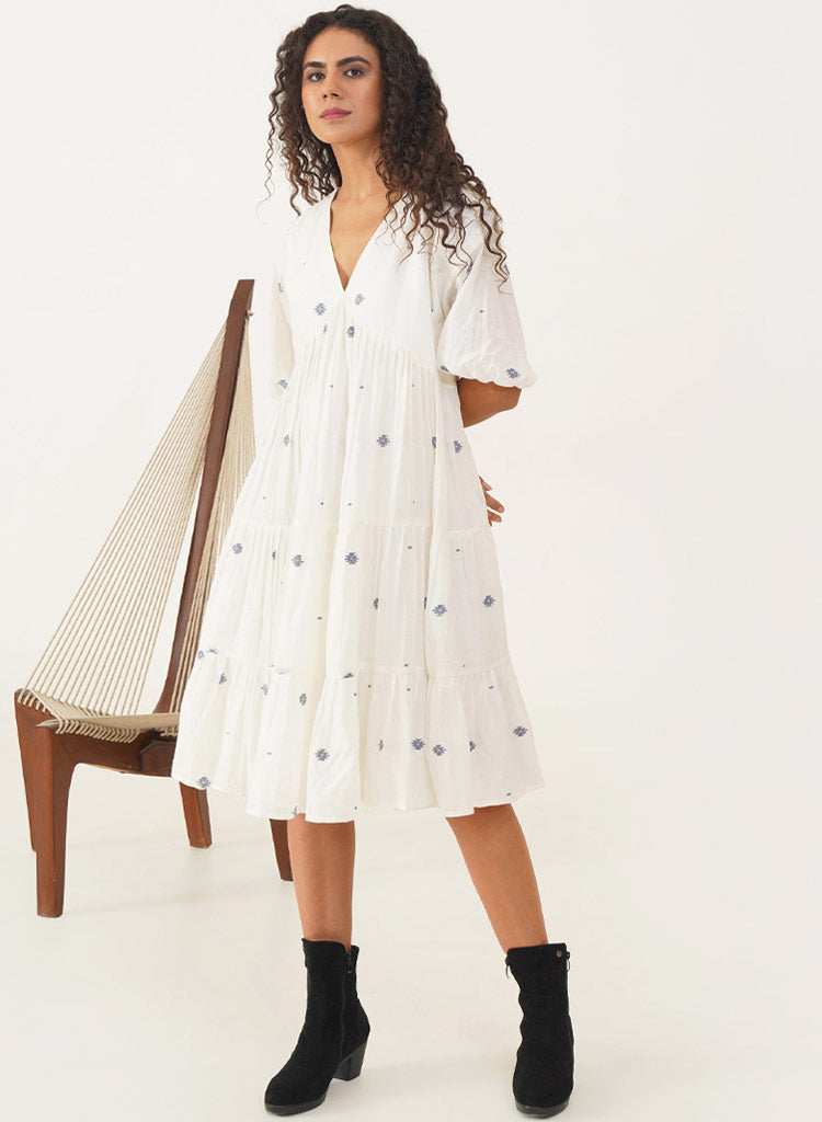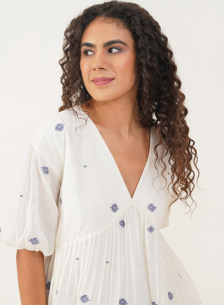 A timeless Jamdani dress designed with comfort and effortless movement in mind. This versatile piece showcases a plunging V-neckline, relaxed drop shoulders, and airy bubble sleeves that create a beautiful sense of flow. Delicate gathers add a playful touch of volume, making this dress a perfect blend of elegance and ease. Length 42". The model is 5'8" and is wearing size S.