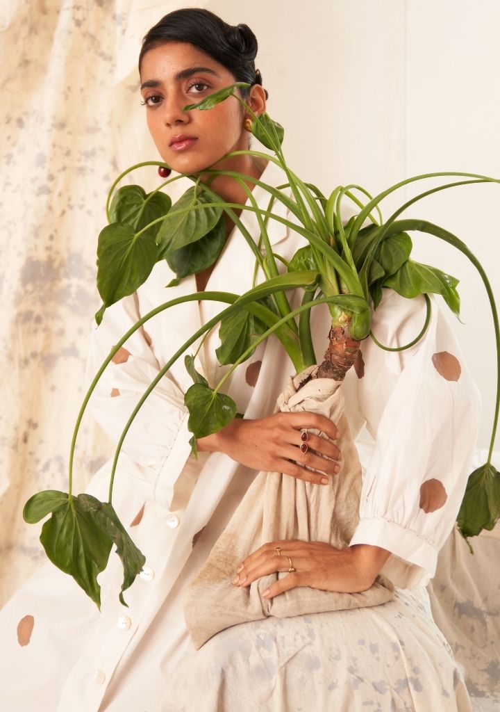An anti-fit trench with hand-painted polka print and embroidery details featuring gathered sleeves, back yoke with box pleat at the back and side seam U rounded pockets with top stitch detailing. The model is 5'7" and is wearing a size M-L.