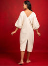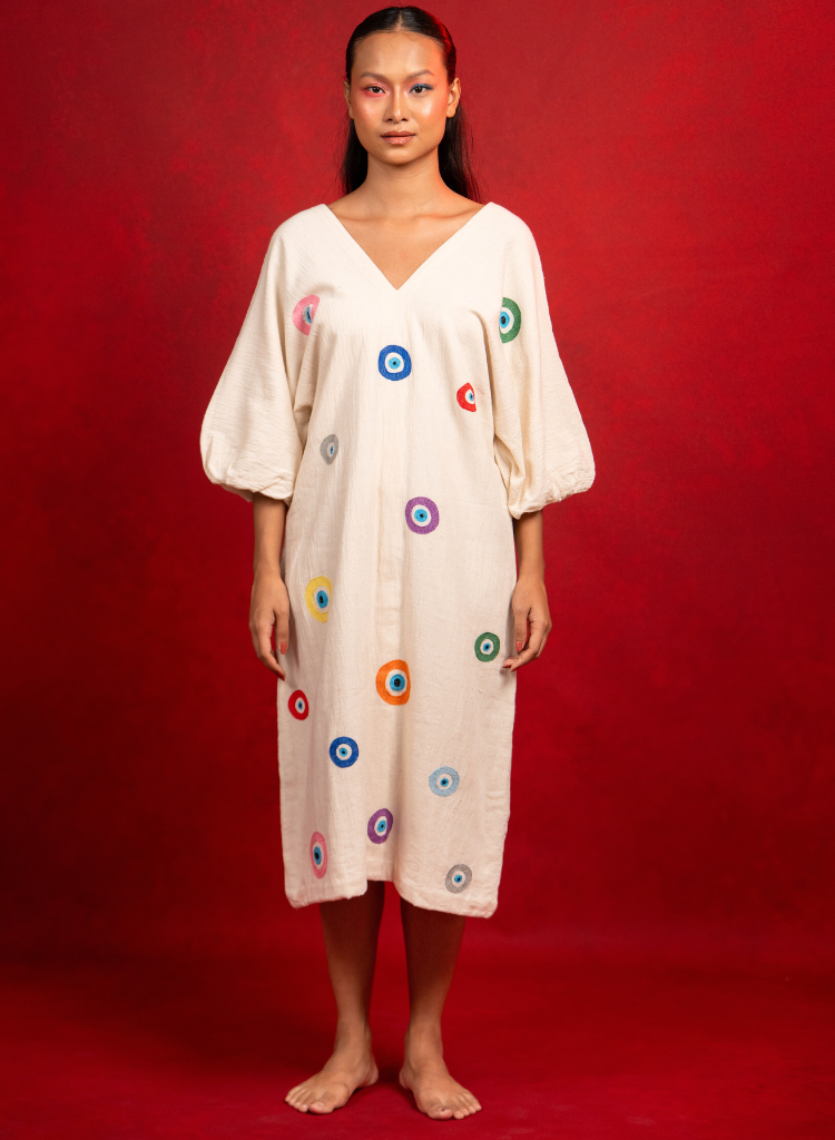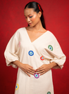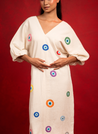 A midi dress with vibrant, multi-coloured eye motifs that are hand-embroidered using cross-stitch, adding a touch of whimsy and charm. Features a regular fit and a V-neck at both the front and back. Length 44". The model is 5'5" and is wearing size S.
