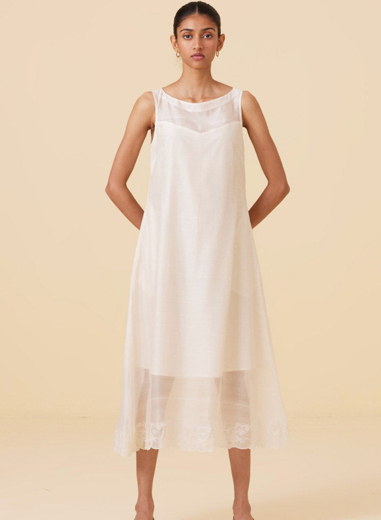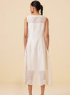 A vintage inspired dress with a delicate embroidery at the hem inspired by lace. The model is 5'8" and is wearing size XS.