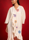 A cover-up perfect for layering, offering a soft and breathable feel. The cover-up is adorned with vibrant, multicoloured circular eye motifs, hand-embroidered with cross stitch, making each piece unique. With its loose, relaxed fit and elbow-length sleeves, this cover-up is ideal for casual outings or as a stylish layer over swimwear. Length 36". The model is 5'5" and is wearing size S.