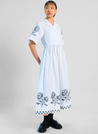 A midi dress featuring an intricate black thread embroidery, notched lapels and an elasticated waist. The model is 5'6 and is wearing size S.