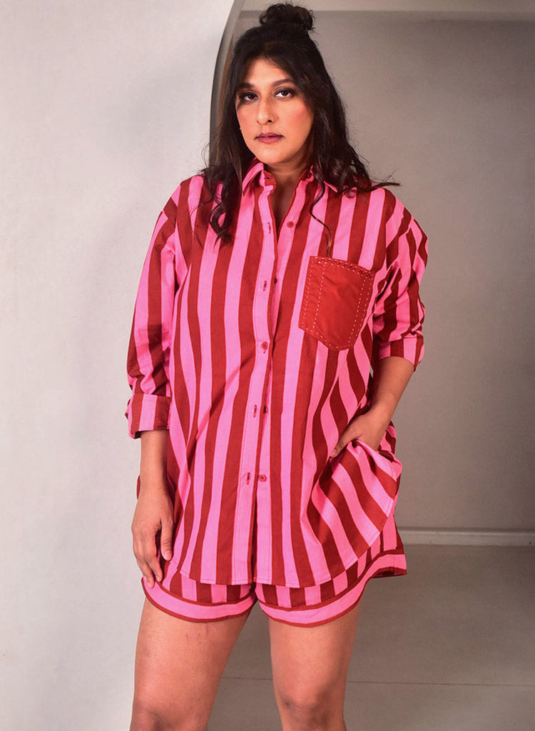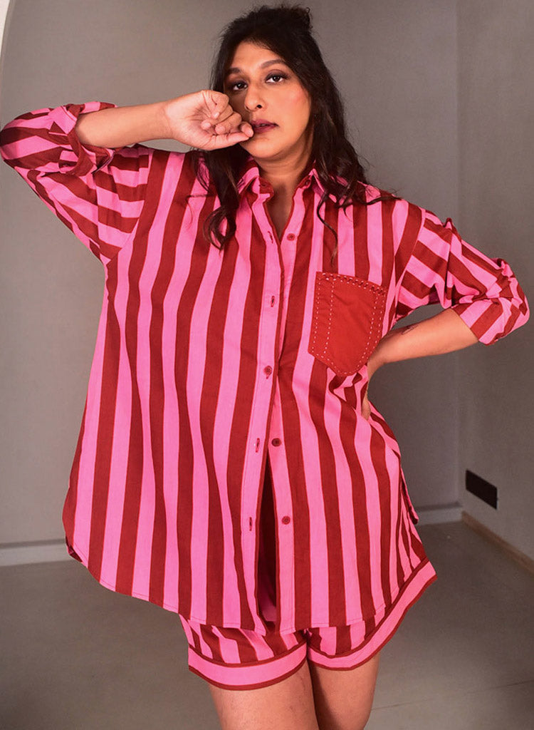 A two-piece set pairing the Serena Shirt and the Serena Shorts. The oversized striped hand-screen printed shirt features classic collars, hand embroidery detailing on the pocket and buttons down the centre. Front length 29", Back length 31". The pair of matching striped shorts for easy styling of staples. These loose, flared shorts come with inseam pockets. Length 13.5". The model is 5'6" and is wearing size M.