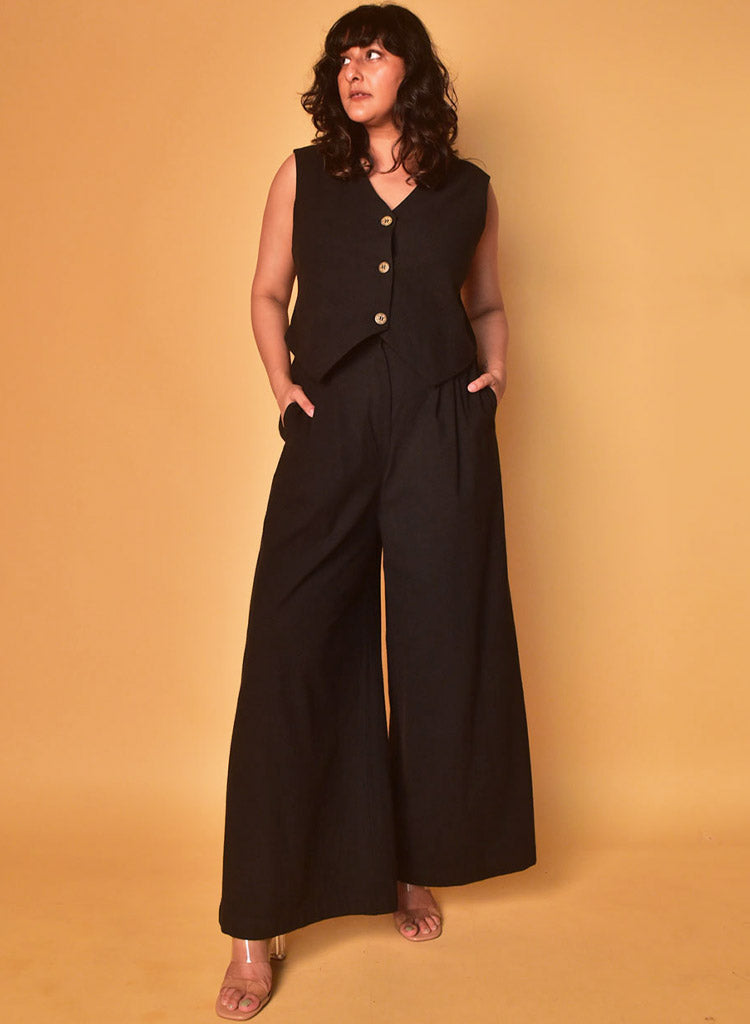 A pair of pleated pants featuring an elasticated waist at the back and inseam pockets. Length 41". The model is 5'6" and is wearing size L.