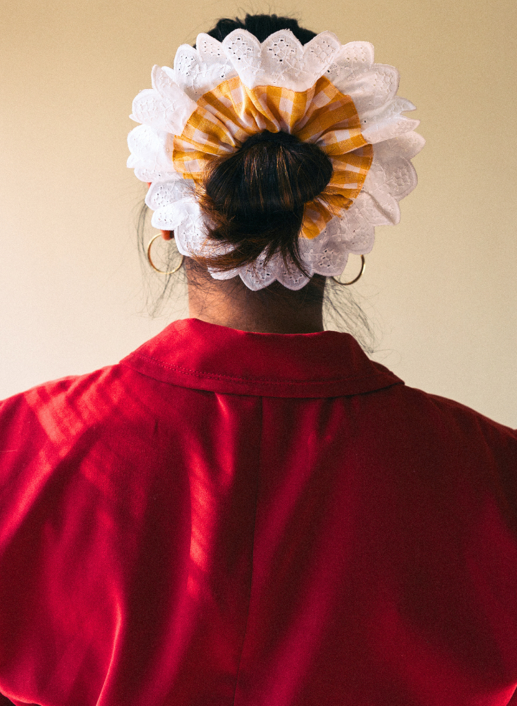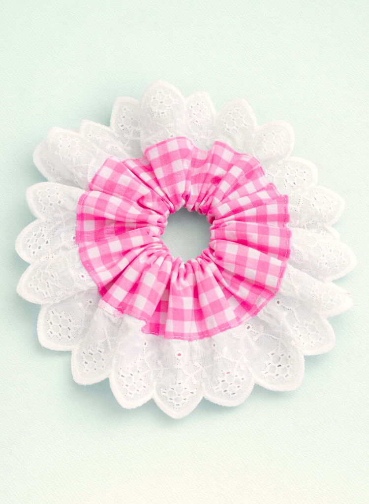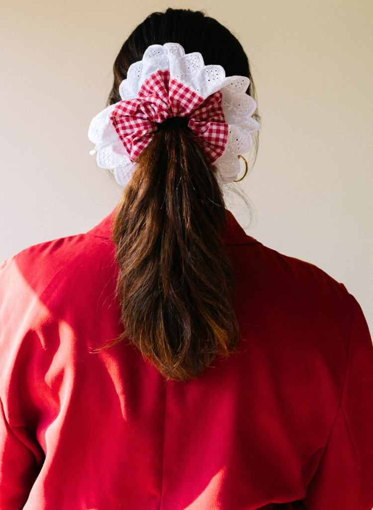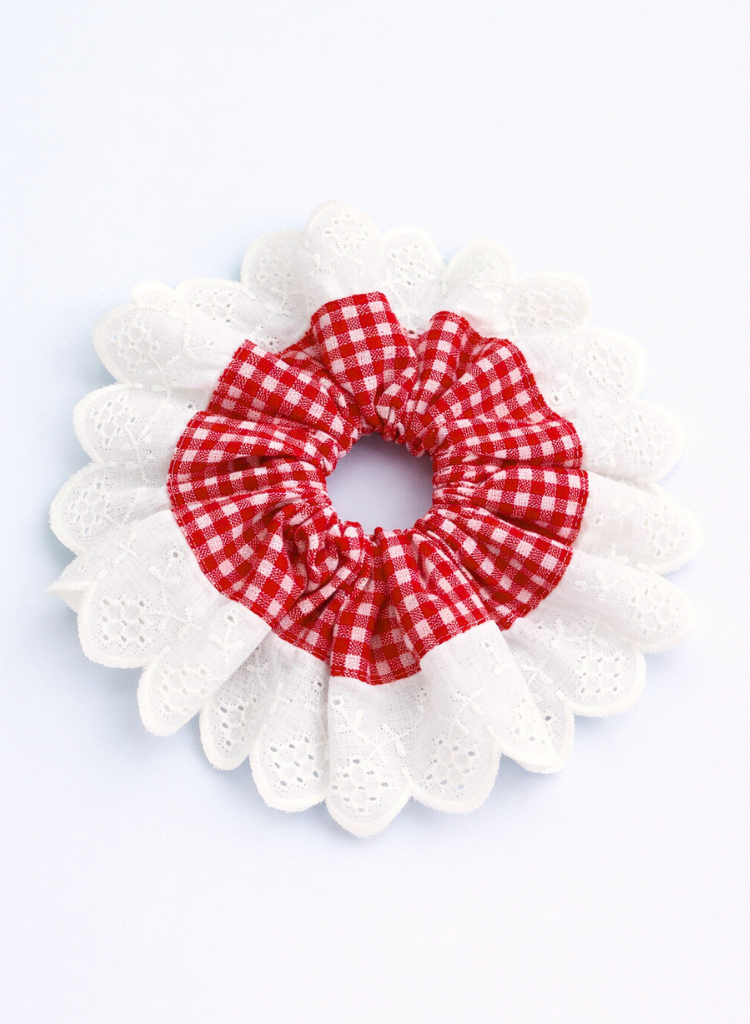 The queen's ruff. Big scrunchie in gingham with a cotton lace border. Dimensions 7.5" Dia.