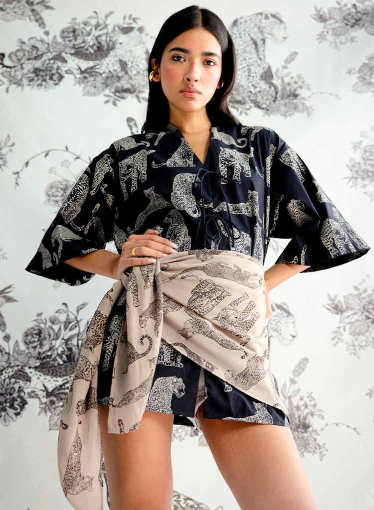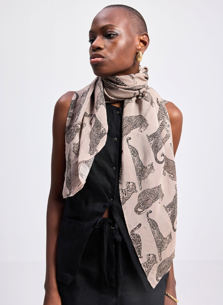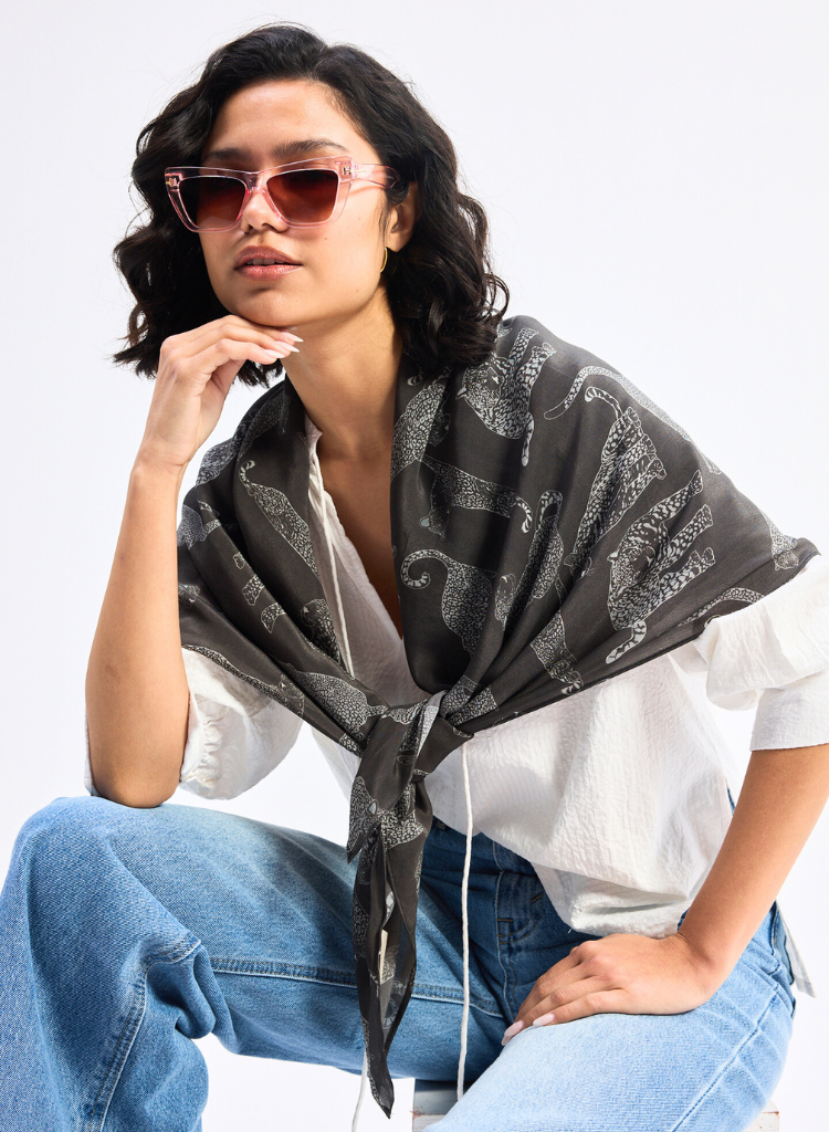 A hand-drawn animal print scarf crafted in eco-friendly crepe is just what you need to add that extra bit of flair to your outfit. Light, flowy, and effortlessly chic, it’s the perfect accent to bring together any look, making it ideal for all seasons.