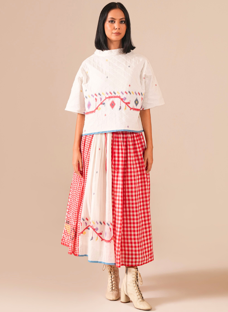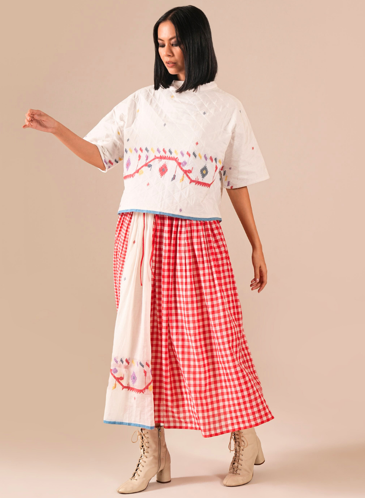 A two-piece set pairing a boxy top and a gathered skirt. The boxy top features short sleeves and contrast panel detailing. Length 21". The gathered skirt features an elasticated waist and side pockets. Length 35". Fully lined. The model is 5'8" and is wearing size S.