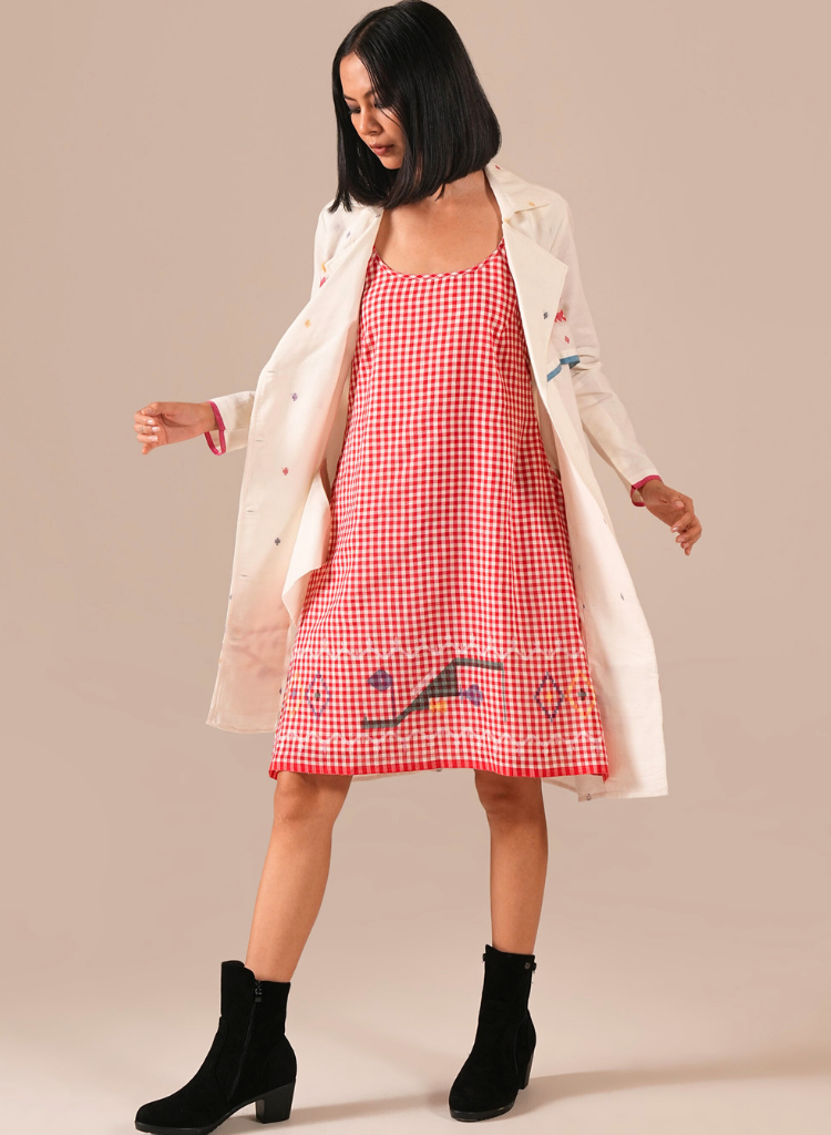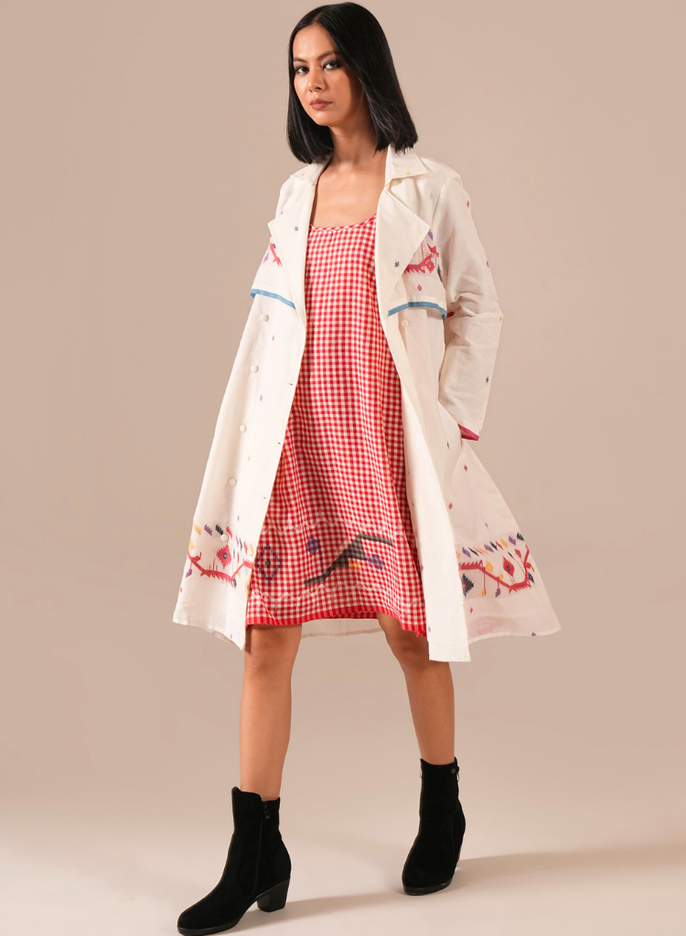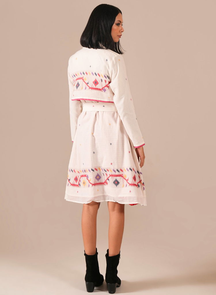 A two-piece set pairing a dress and a coat. The dress features a round neck and embroidery details. Length 37". Fully lined. The long double-breasted coat features a wrap-over front, notched lapel collar, and slanted welt pockets. Length 39". Comes with a removable tie belt The model is 5'6" and is wearing a size S.