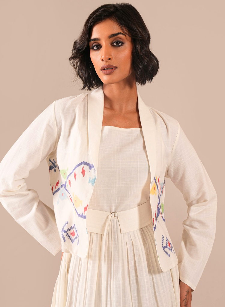 A two-piece set pairing the Lily Glow Dress and matching jacket. The fit-and-flare dress with adjustable straps features a signature fabric belt, back zipper and functional side pockets. Length 51". Lined. The tailored cropped jacket features a lapel collar and long sleeves. Length 20". The model is 5'6" and is wearing a size S.