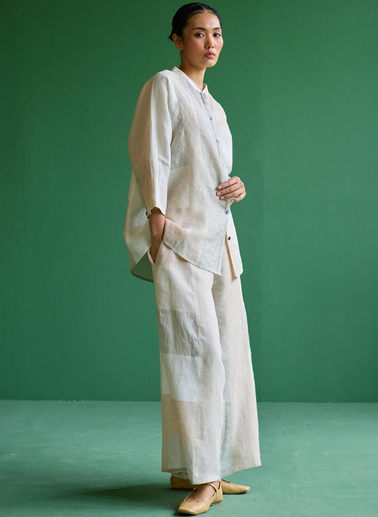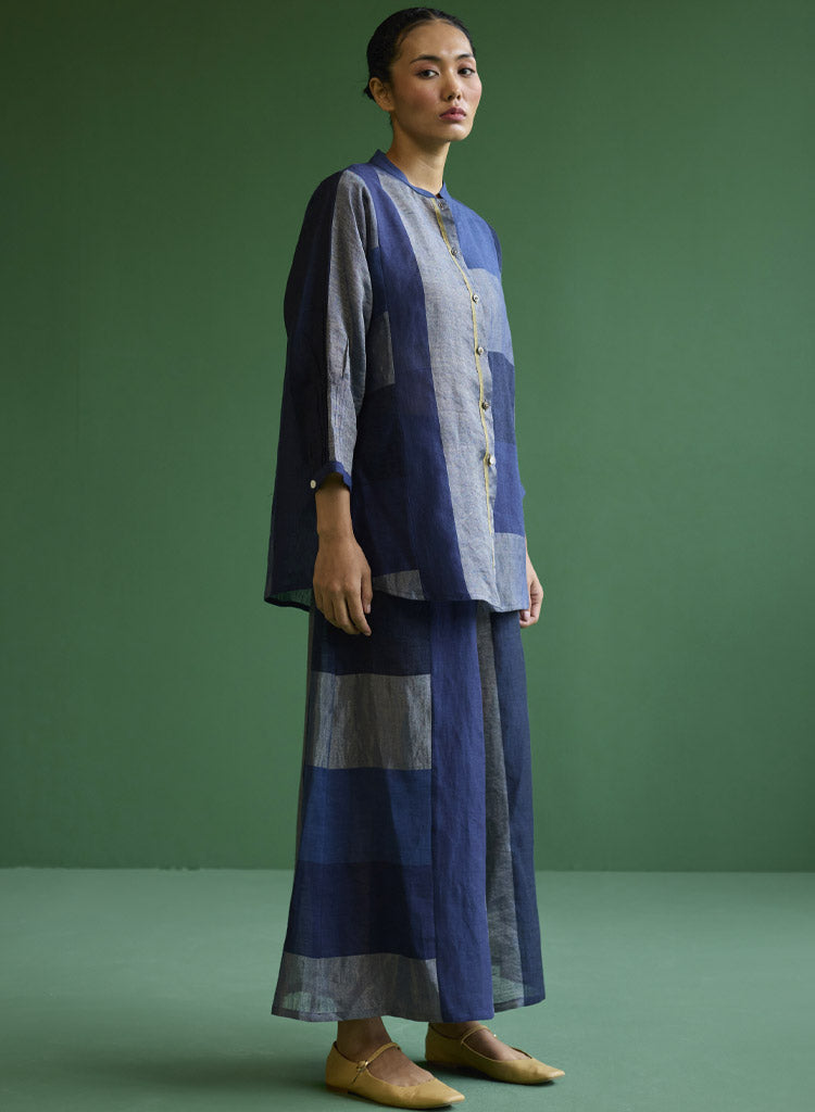 A statement patchwork shirt featuring 3/4th sleeves, a mandarin collar, pleated sleeve cuff detail, brass and linen covered buttons. Length 29". The model is 5'8" and is wearing a size S.