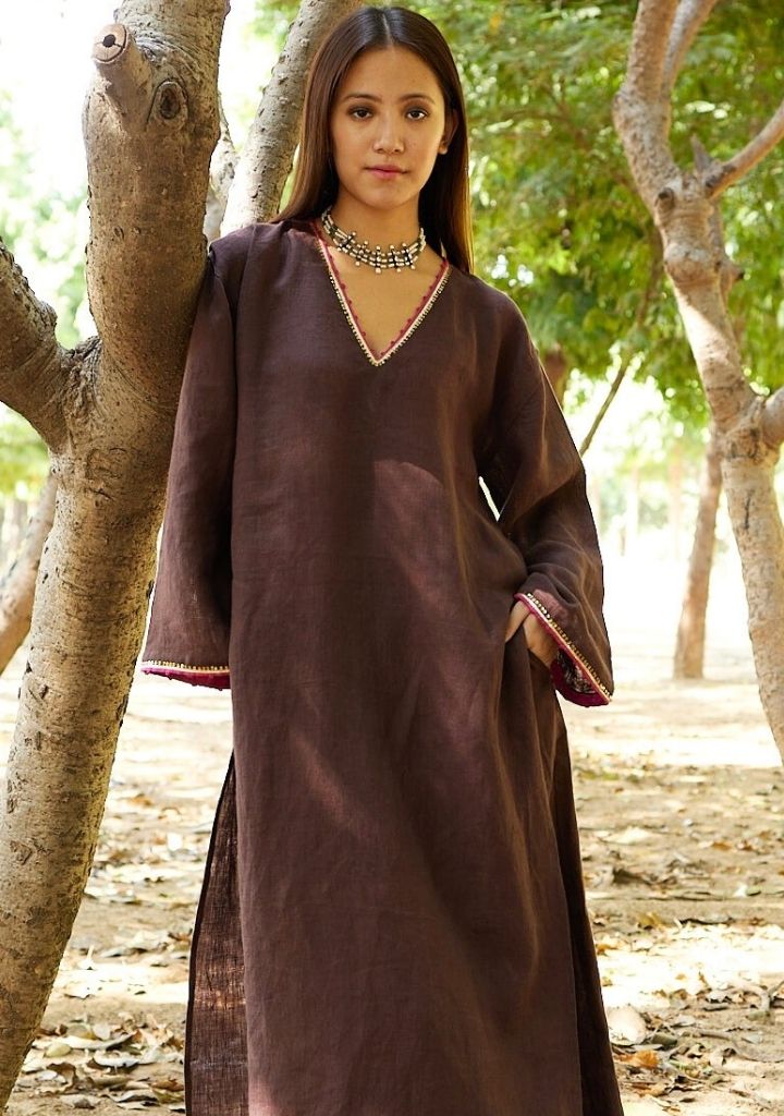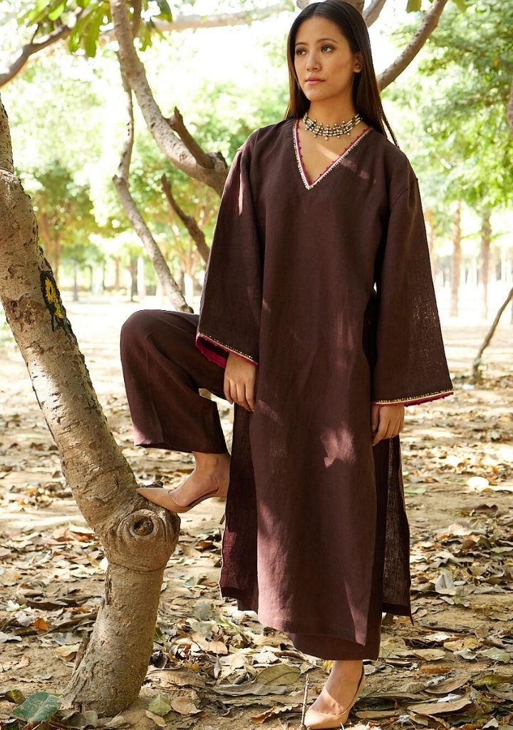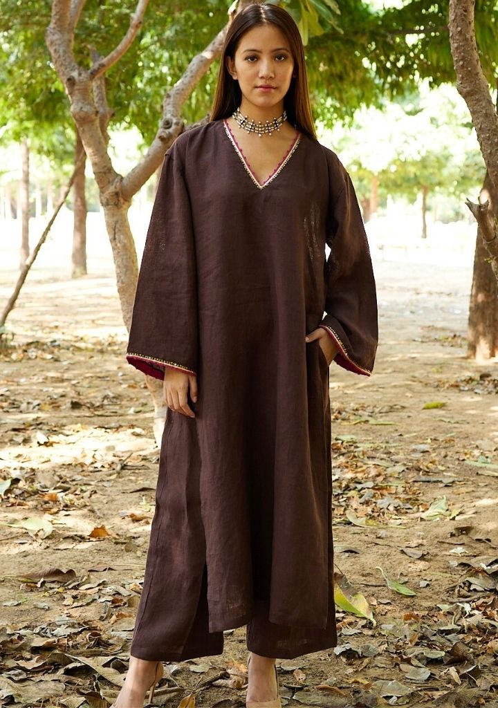A two piece set pairing a V-neck kurta and matching pants. The kurta with intricate hand-embroidered detail and a sequence finish features a V-neck and wide sleeves. Length 48". The matching pants feature a fitted waist with pleat details and inseam pockets. Length 36". The model is 5'6" and is wearing size S.