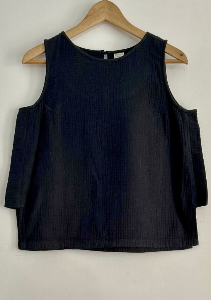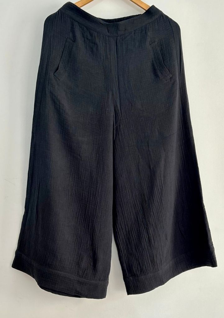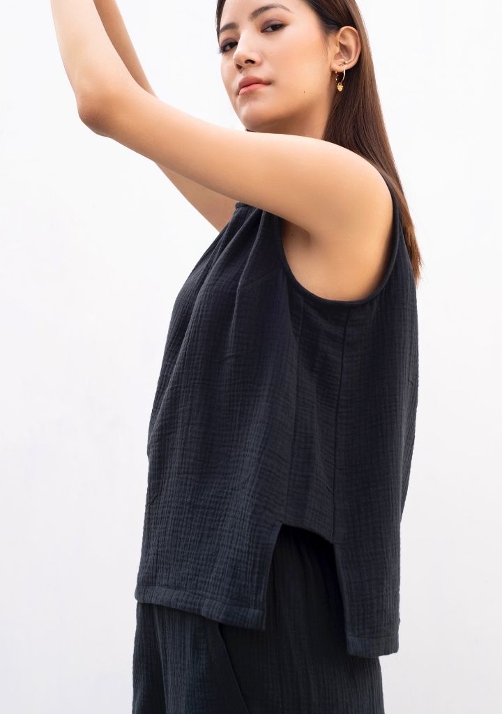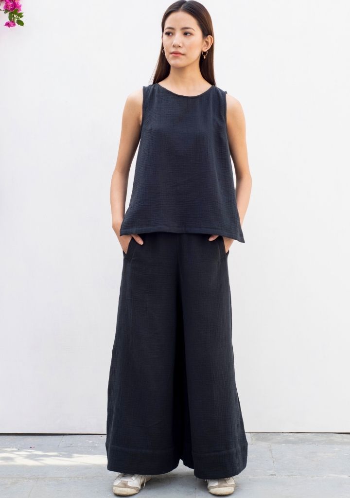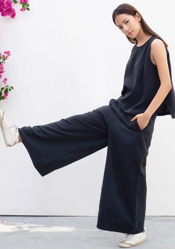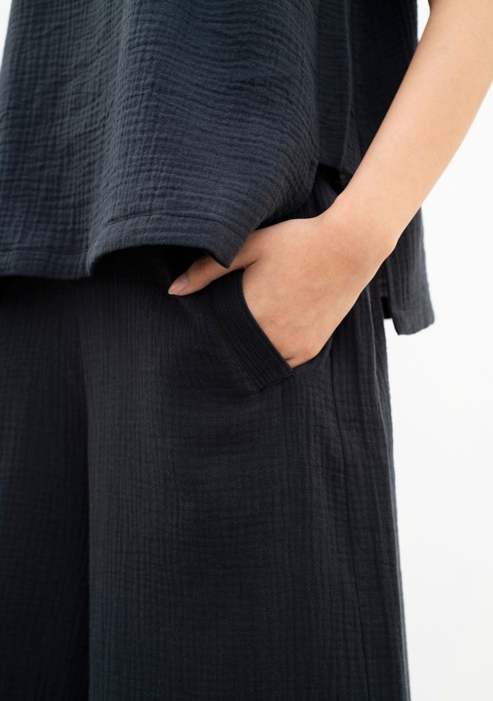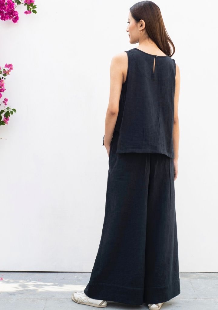 A two-piece set pairing a side panel top and wide-leg pants. The relaxed-fitting top with side panels features a round neck and a back keyhole opening. Length 23". The wide-leg pants with an elasticated back waist belt feature side pockets. Length 35.5". The model is 5'6" and is wearing size XS.