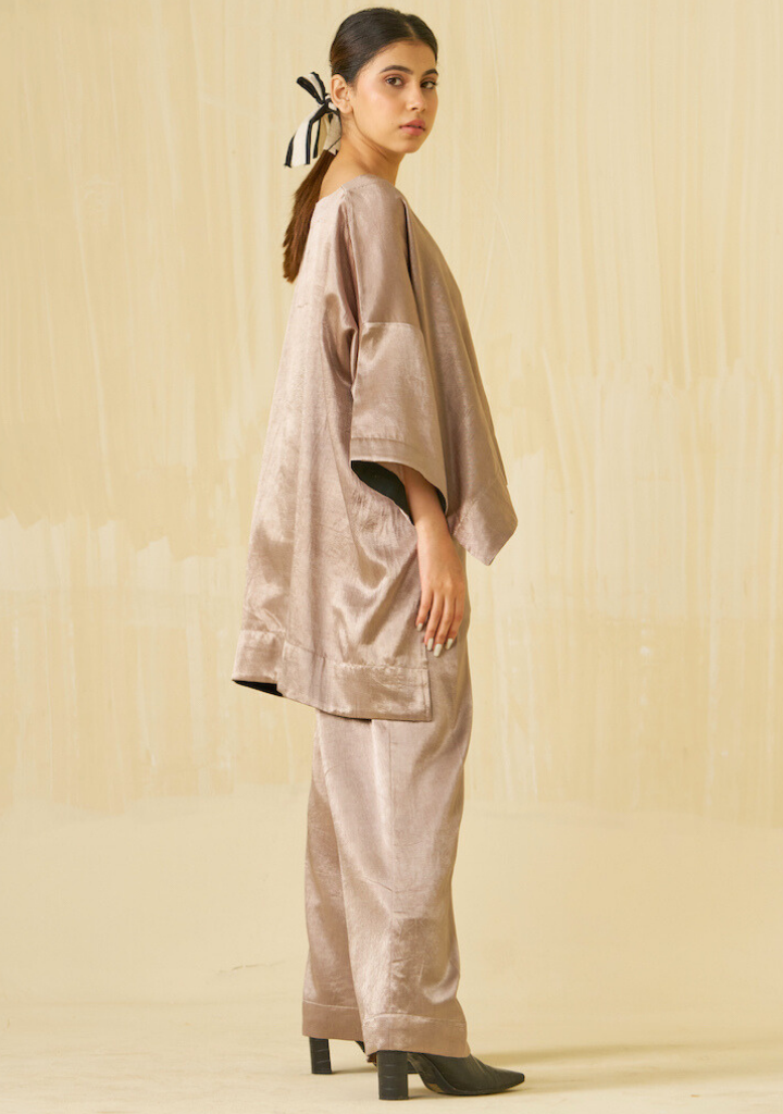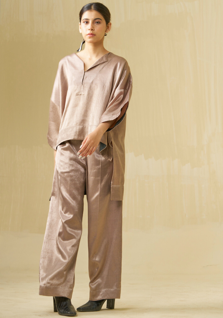 An oversized top with high-low hem and side slits featuring neckline with center slit and 3/4th sleeves. Front Lenth 22.5" Back Length 30". The model is 5'5" and is wearing size S.