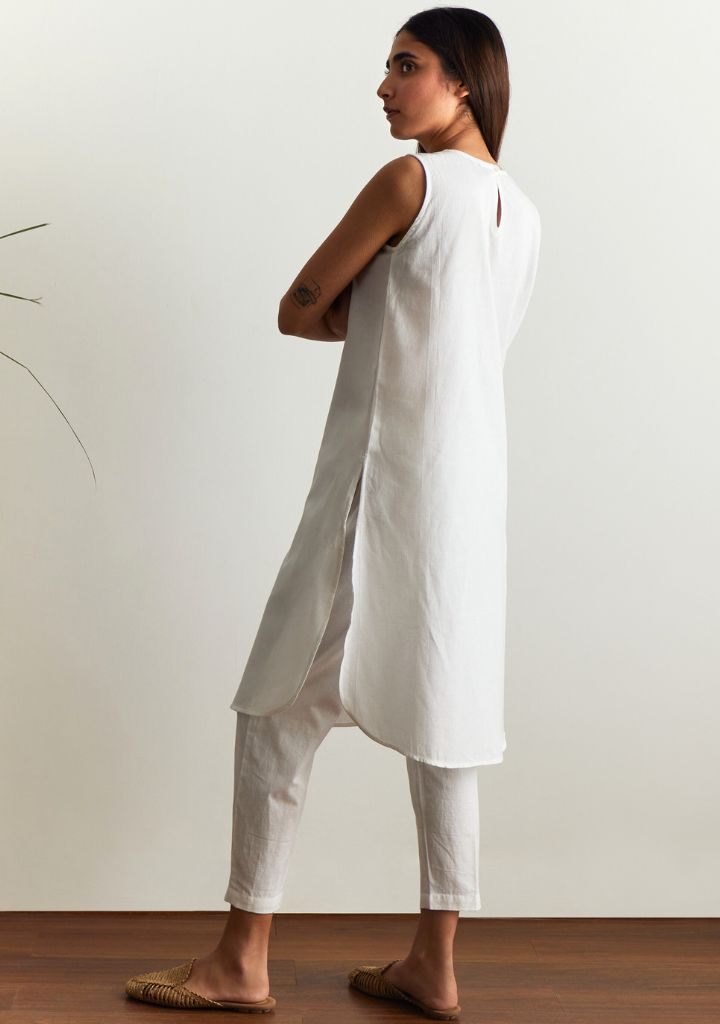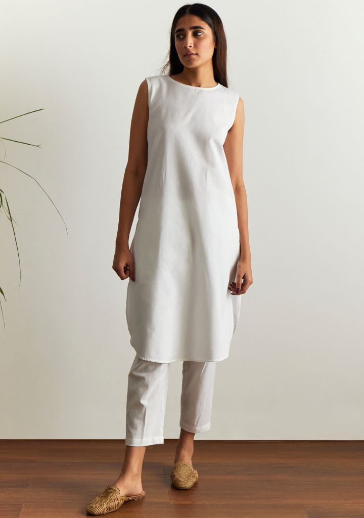A two-piece set pairing a straight kurta and ankle ankle-length pants. The sleeveless straight-fitting kurta with a round hem and side slits features a round neck. Length 40". The straight-fitting ankle-length pants feature a fitted waist and inseam pockets. Length 34". The model is 5'6" and is wearing size S.