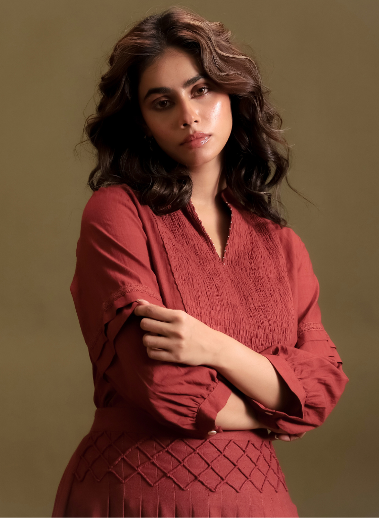 A two-piece set pairing the Terracotta Top and the Terracotta Skirt. The top features a V-neckline with ruching detailing in front and pleats in the sleeves. Length 23". The midi skirt features intricate embroidery detailing with pleats. Length 32". The model is 5'7" and is wearing a size S.