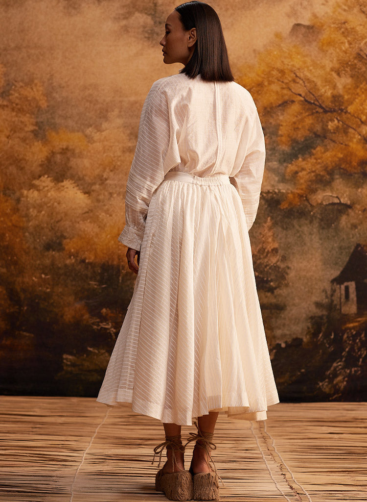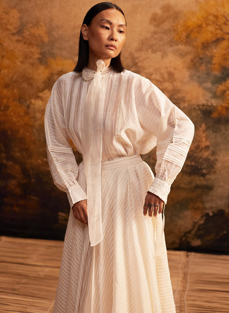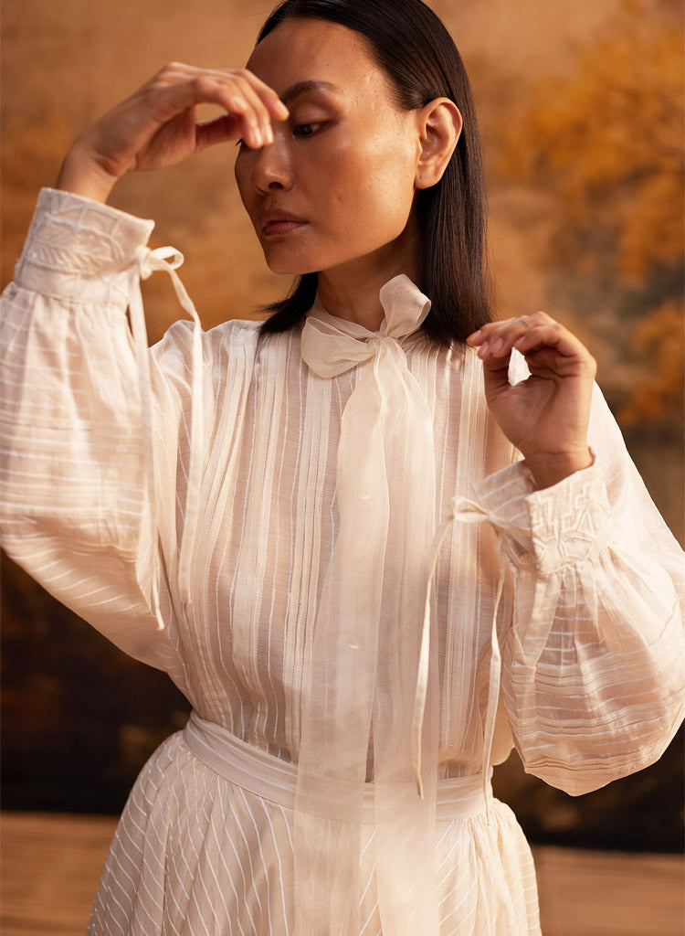 A Dolman sleeve shirt with pleated accents featuring a organza tie-up detail at the neck and embroidered cuffs with tie-ups. Length 26". The model is 5'8" and is wearing a size M.