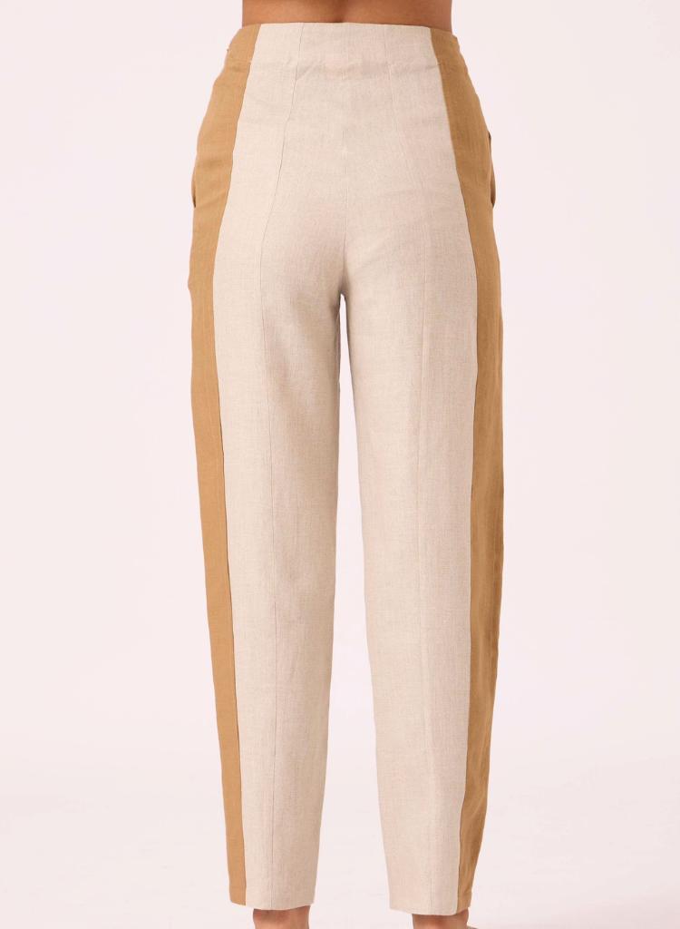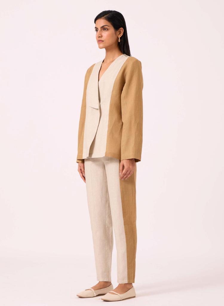 A two-piece set pairing the Dimtri Panelled Jacket and the Tamara Panelled Pants. The single breasted jacket features a draped asymmetric collar and colour block panels for a slimming silhouette. The high rise pants feature colour block panels, in-seam pockets and a side zipper fastening. The model is 5'6" and is wearing size XS.