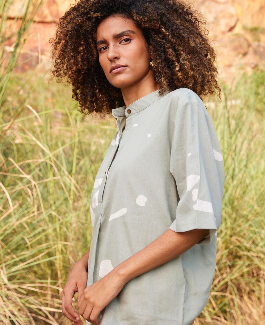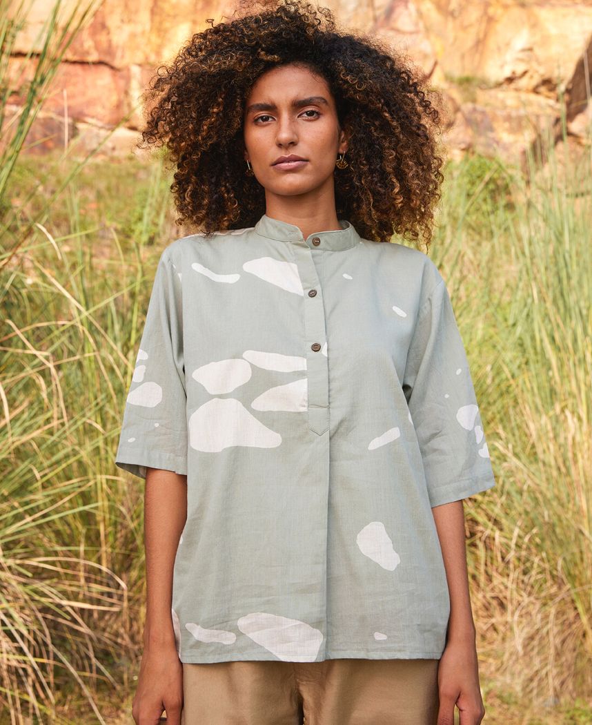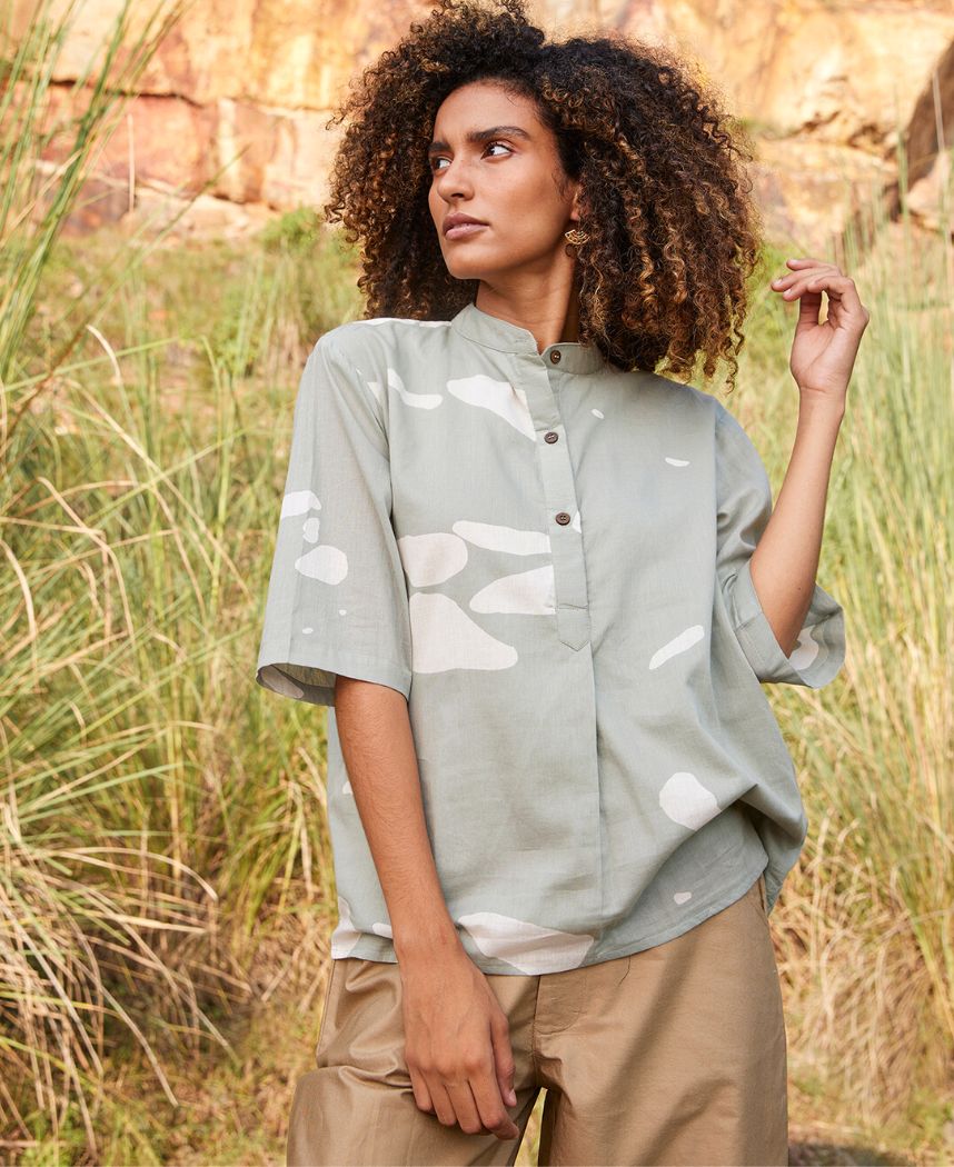 A mosaic printed top featuring a mandarin collar and a front button placket. Length 24.5". Made in cotton. Fully lined.