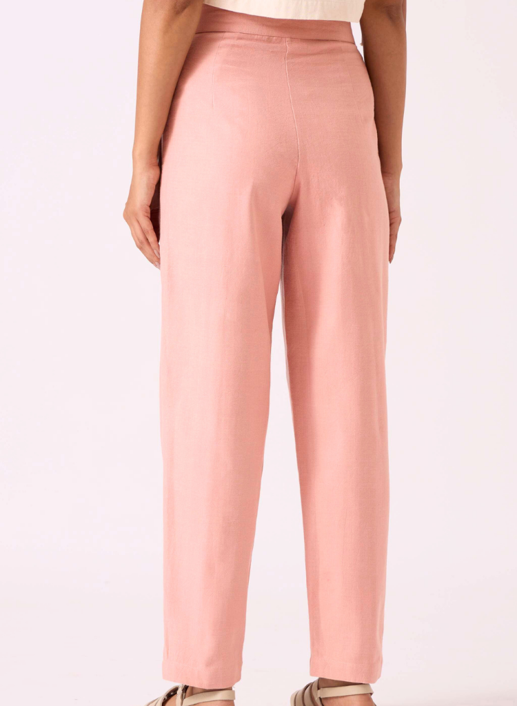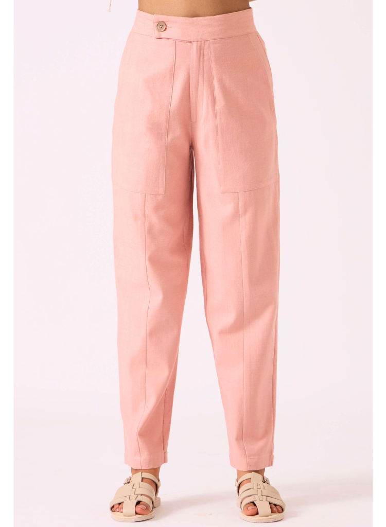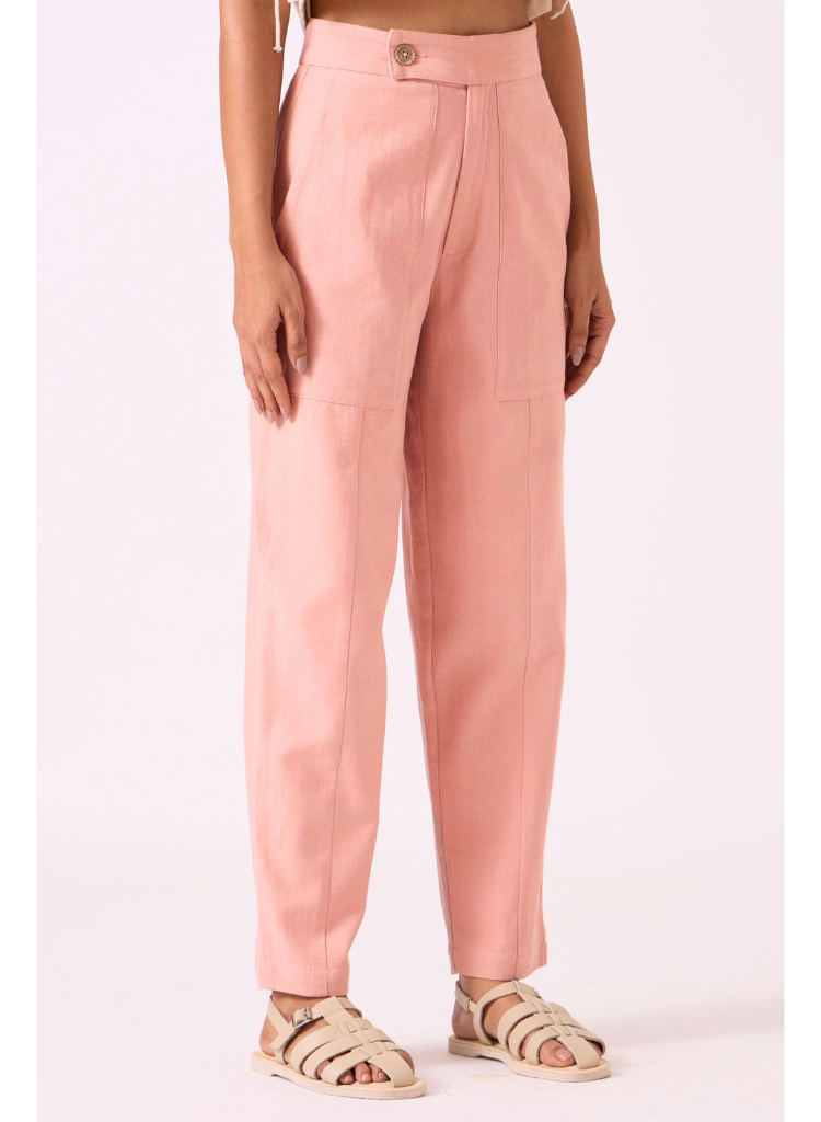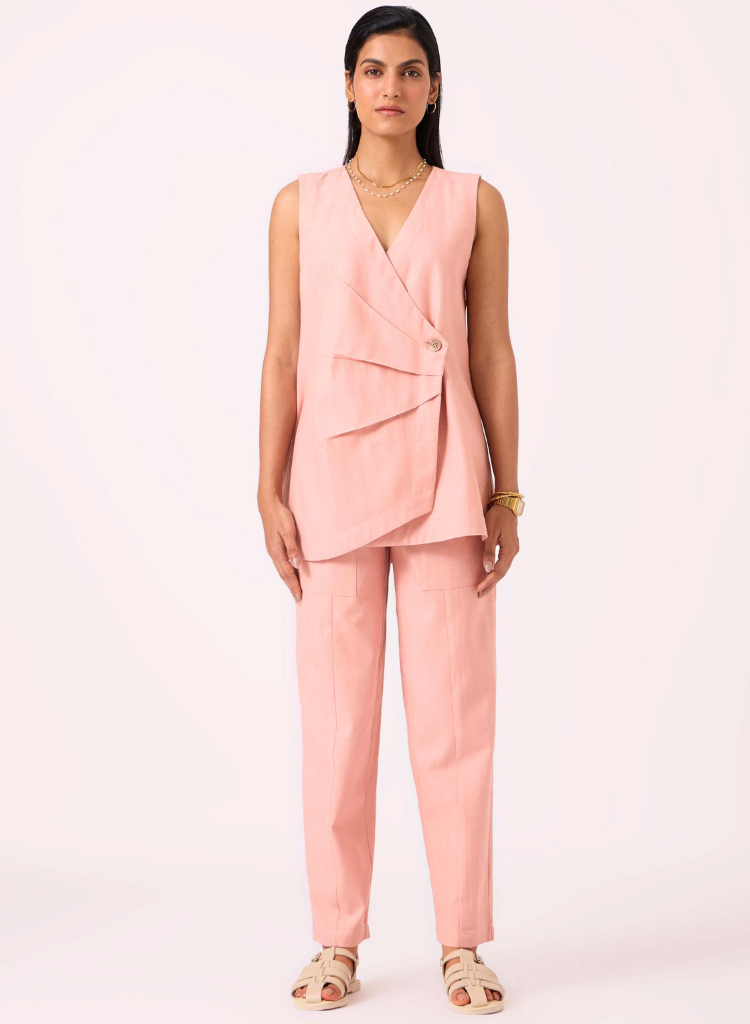A two-piece set pairing the Karenin Handwoven Top and the Victory Handwoven Pants. The V-neck draped sleeveless jacket features an inner tab for an adjustable fit at waist. The mid rise slim fit pants features a front fly with an extended waistband and patched slash pockets. The model is 5'6" and is wearing size XS.