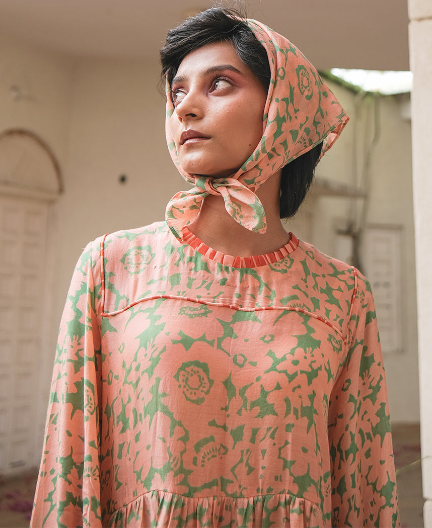 A short panelled dress with a floral hand block print and contrast pleated collar. Features gathered tiers and an eyelet opening in the back. Length 38”. The model is 5'9" and is wearing a size S.
