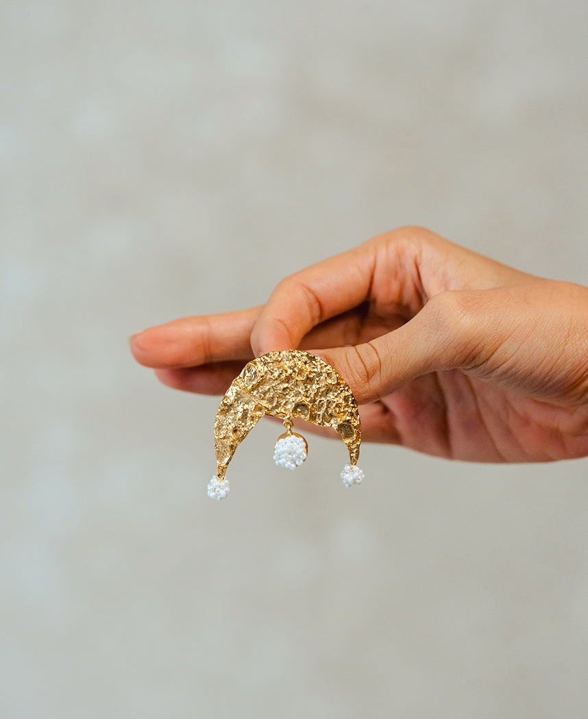 A pair of statement studs in a crescent shape, embellished with glass beads. Size 5 cm. Handcrafted in brass with nickel plating.