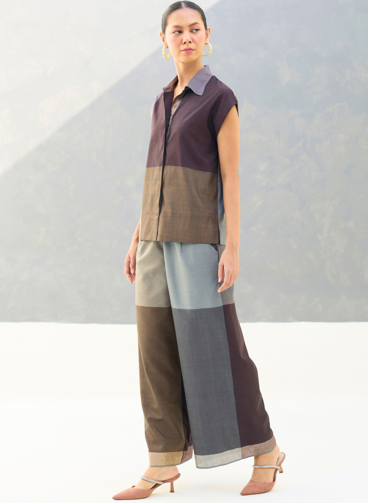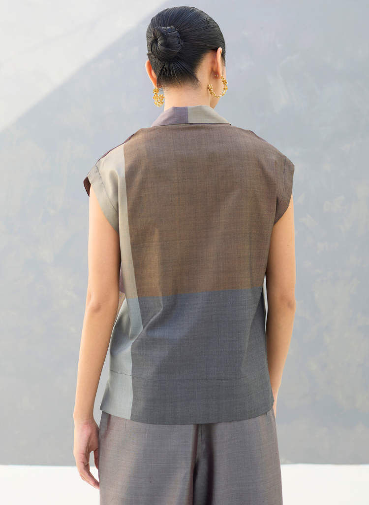 A cap-sleeve shirt in a checkered colour-blocked pattern with 4-5 shades featuring a structured silhouette, a sharp shirt collar and concealed button placket finished with brass buttons. The model is 5'8" and is wearing a size XS.