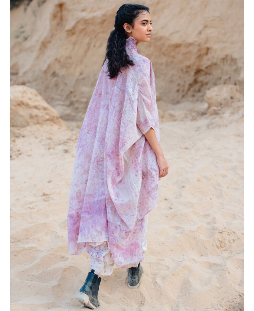 A relaxed eco-printed tunic with an asymmetric hem and gather details. Features a mandarin collar and a front button placket. Front length 32.5", Back length 48". Comes in a free size that fits sizes XS to 3X. The model is 5'6" and is wearing a free size.