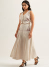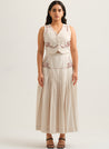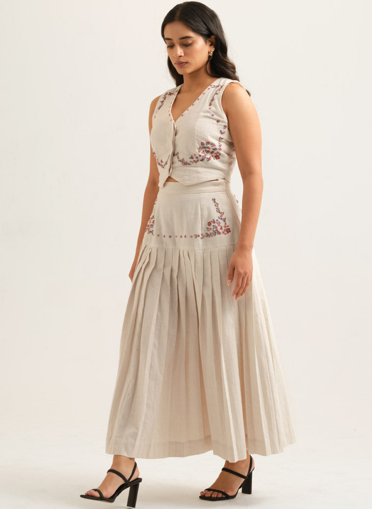 A high waisted skirt with statement hand pleating details, beautifully framed with intricate hand embroidery. Features a side zipper, pockets and a self lining. Length 35". The model is 5'5" and is wearing size S.