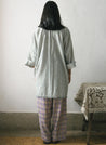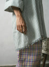 A relaxed fitting pinstripe shirt with hand embroidery and fray edges. Features a V-neck, shell buttons and loose kimono sleeves. Length 34". The model is 5'7" and is wearing a size M.