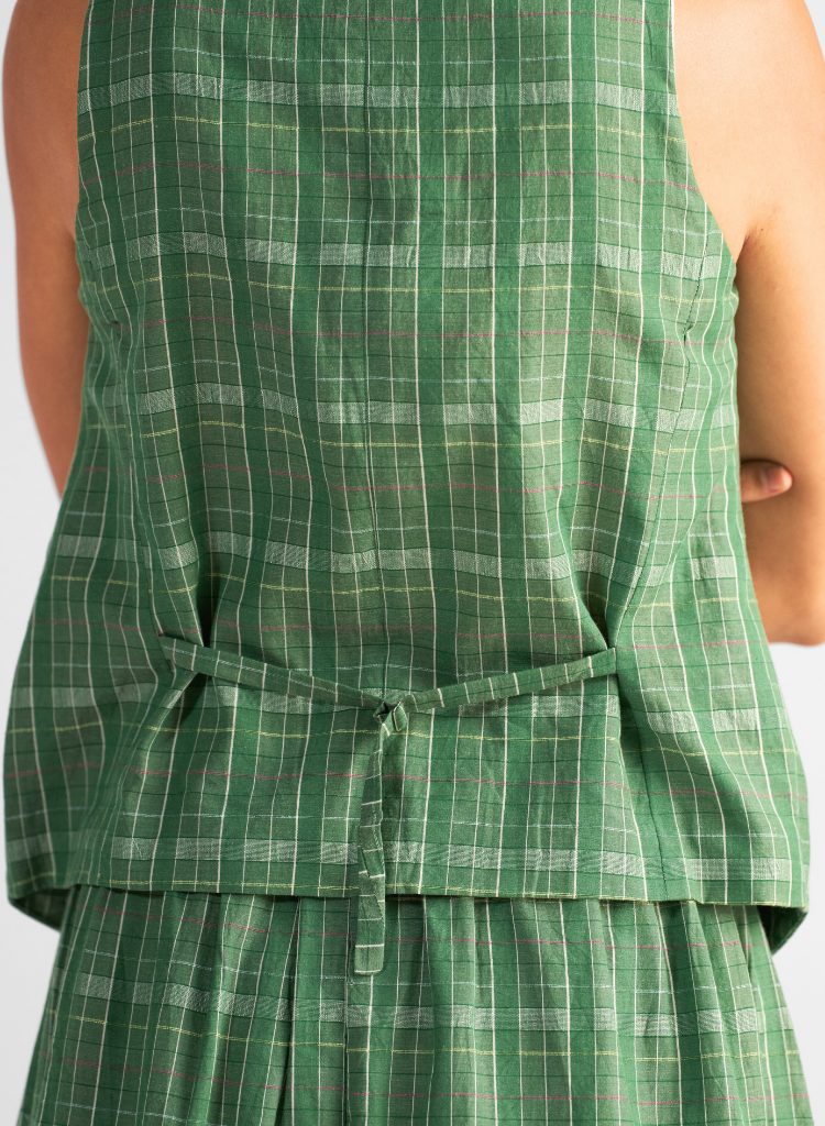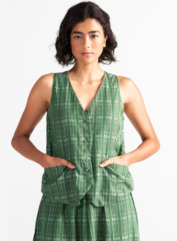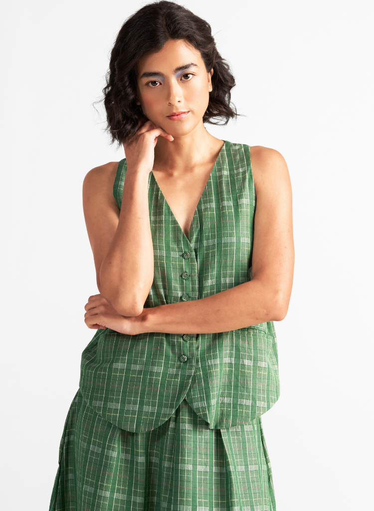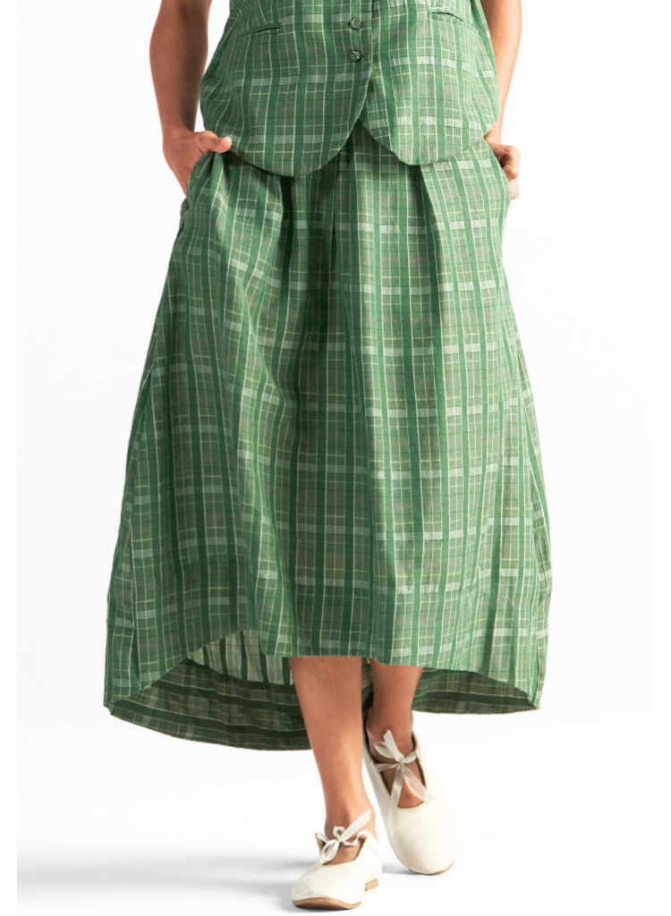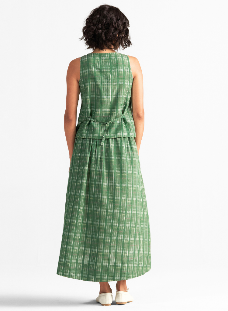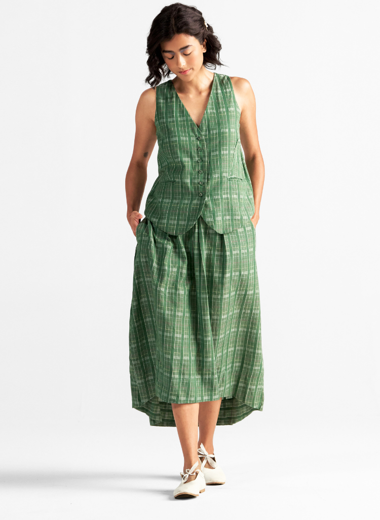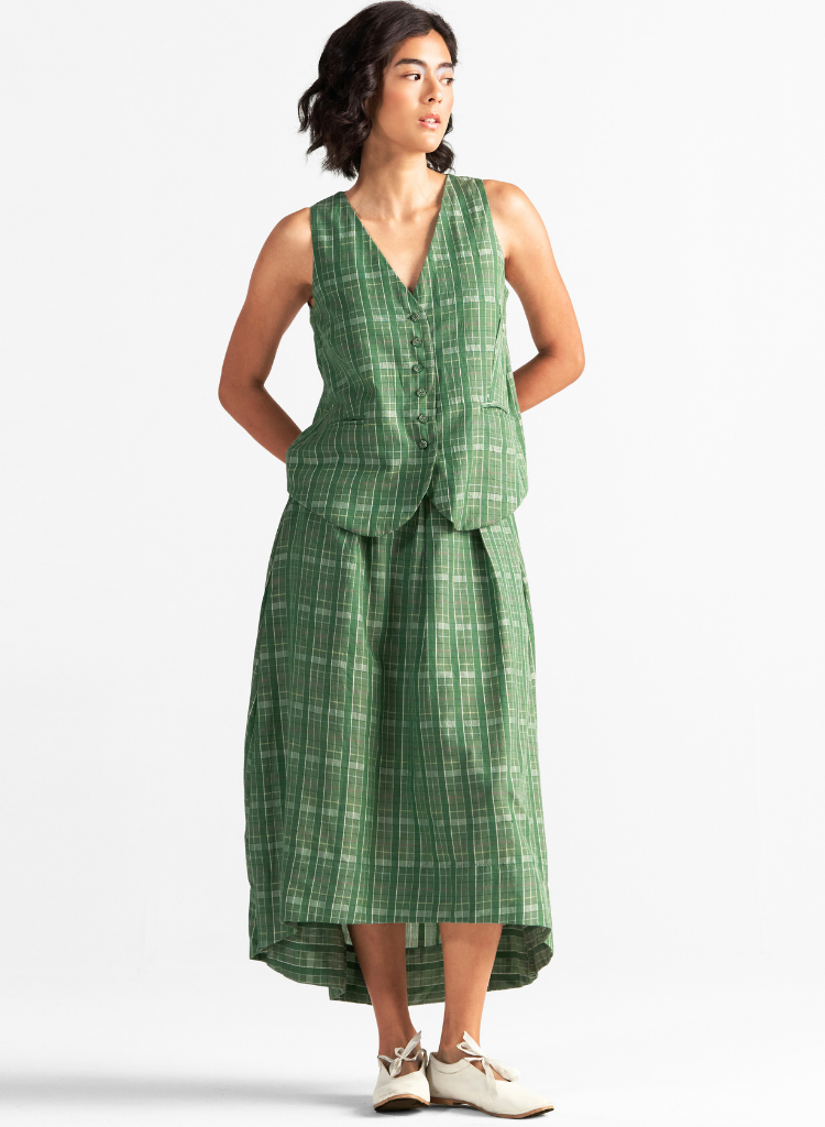 A two-piece set pairing a sleeveless waistcoat and matching skirt. The sleeveeless waistcoat features a V-neck, fabric buttons and flap pockets. Front length 23", Back length 20". The breezy high low skirt features an elasticated waist and inseam pockets. Front length 23", Back length 34". The model is 5'6" and is wearing a size XXS.