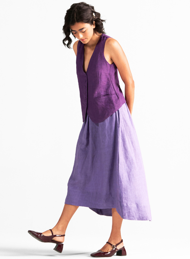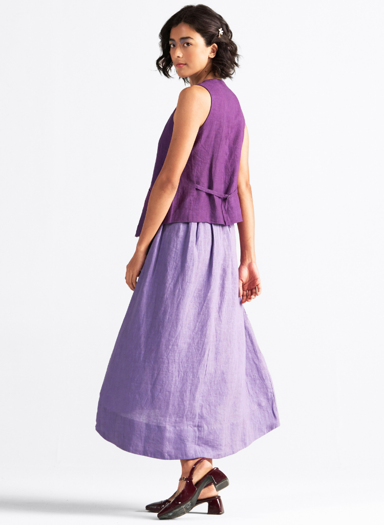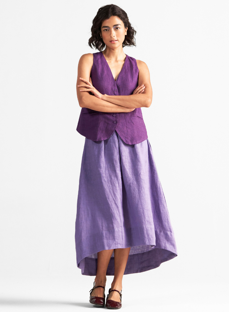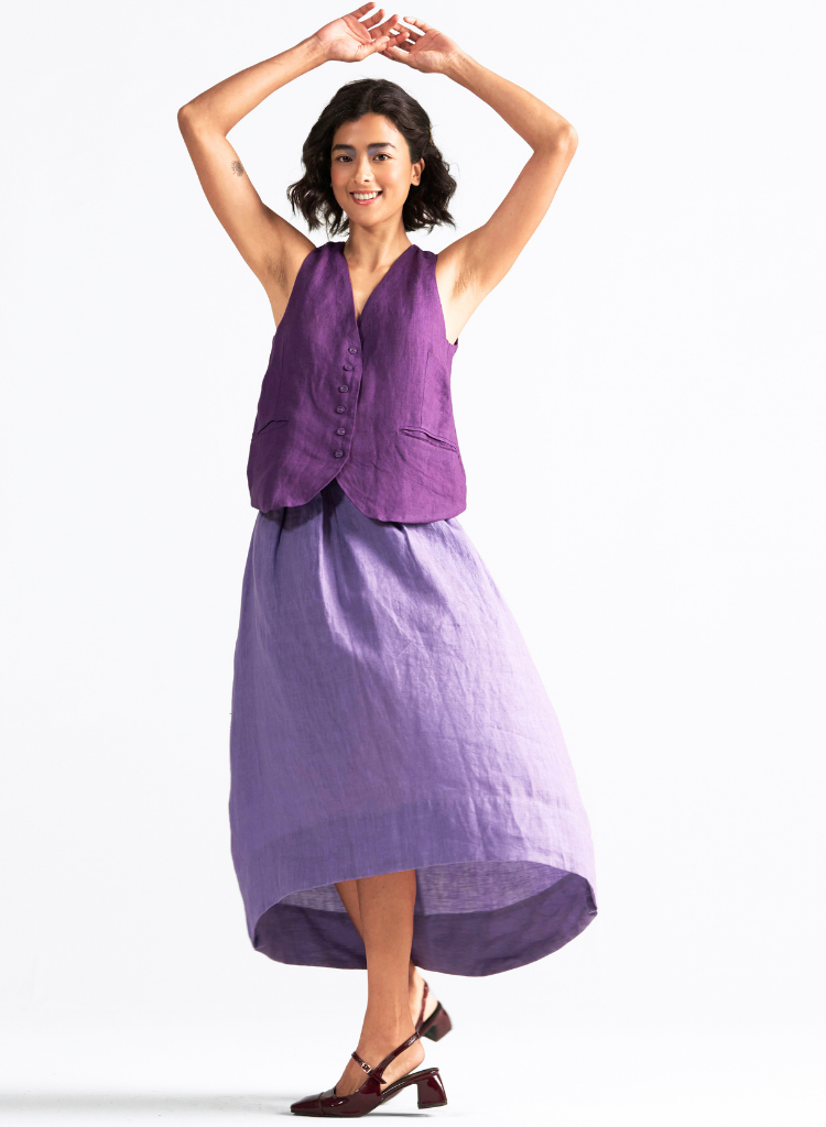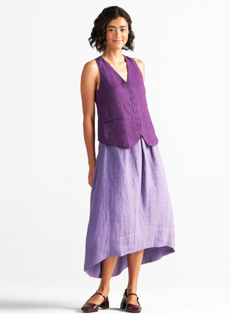 A two-piece set pairing a sleeveless waistcoat and matching skirt. The sleeveless waistcoat features a V-neck, fabric buttons and flap pockets. Front length 23", Back length 20". The breezy high low skirt features an elasticated waist and inseam pockets. Front length 23", Back length 34". The model is 5'6" and is wearing a size XXS.