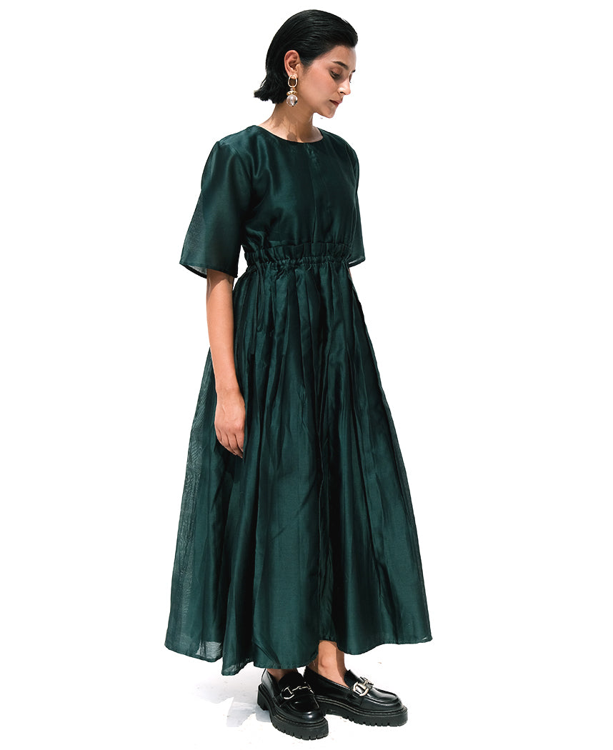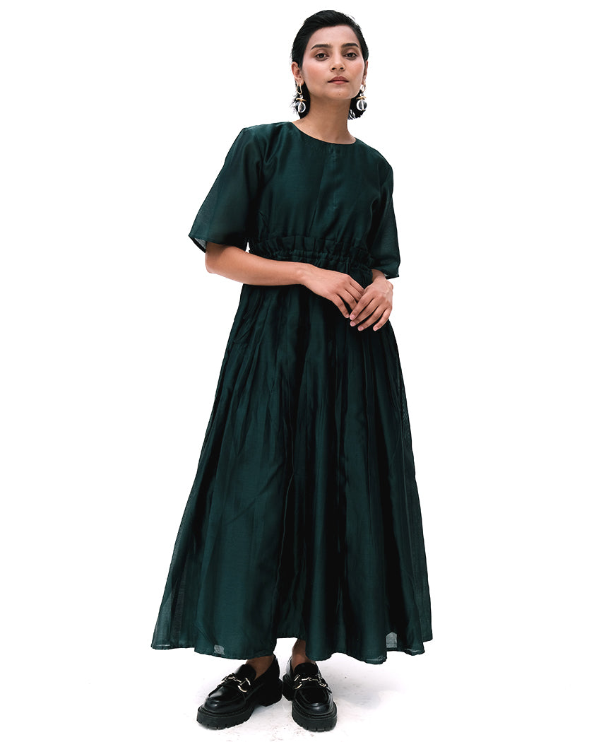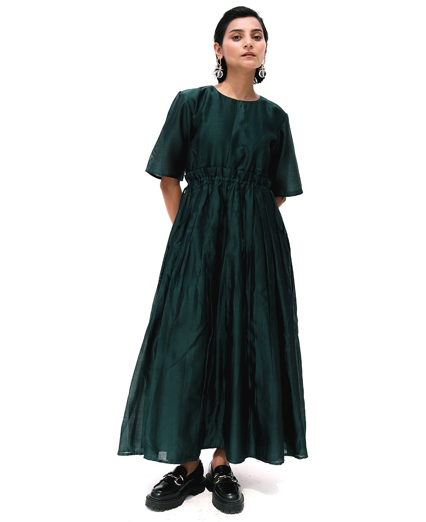 A gathered maxi dress featuring a round neck, adjustable tie-ups at the waist and a back zipper closure. Length 50". The model is 5'4" and is wearing a size S.