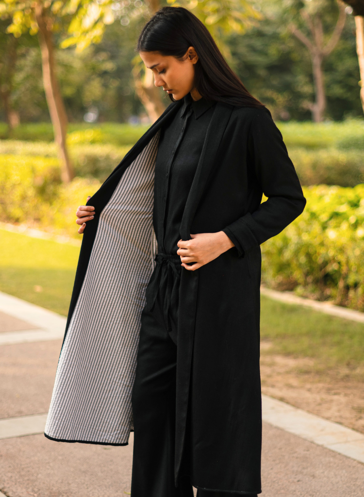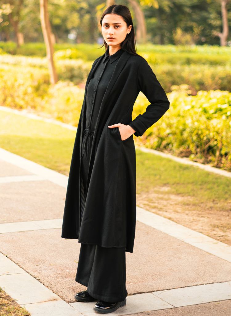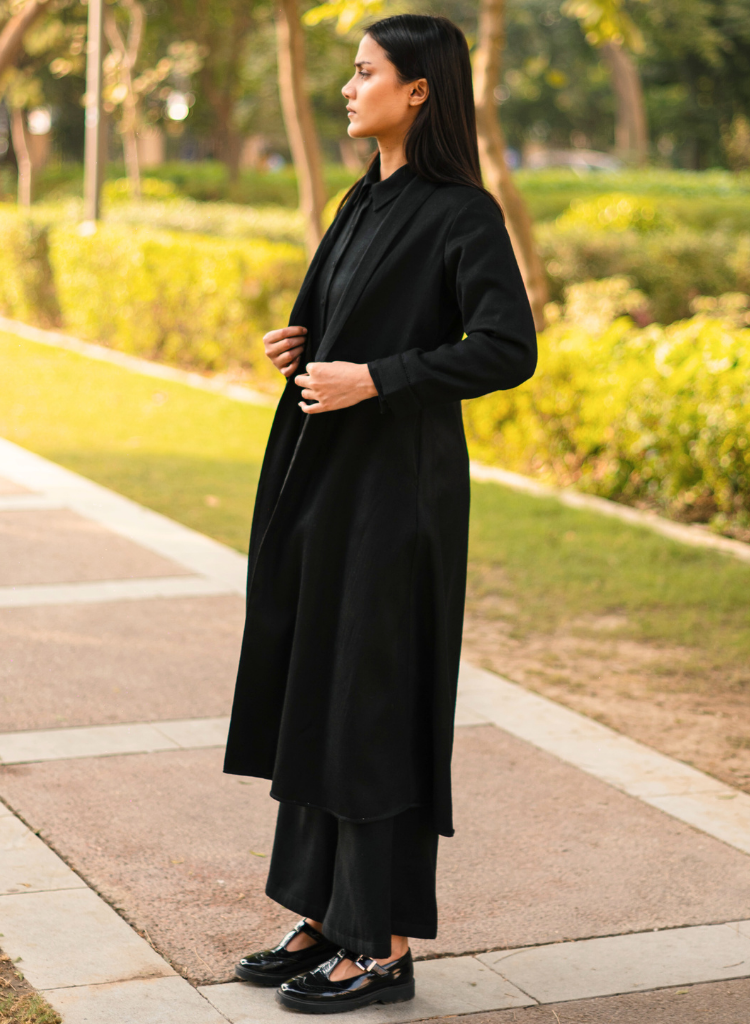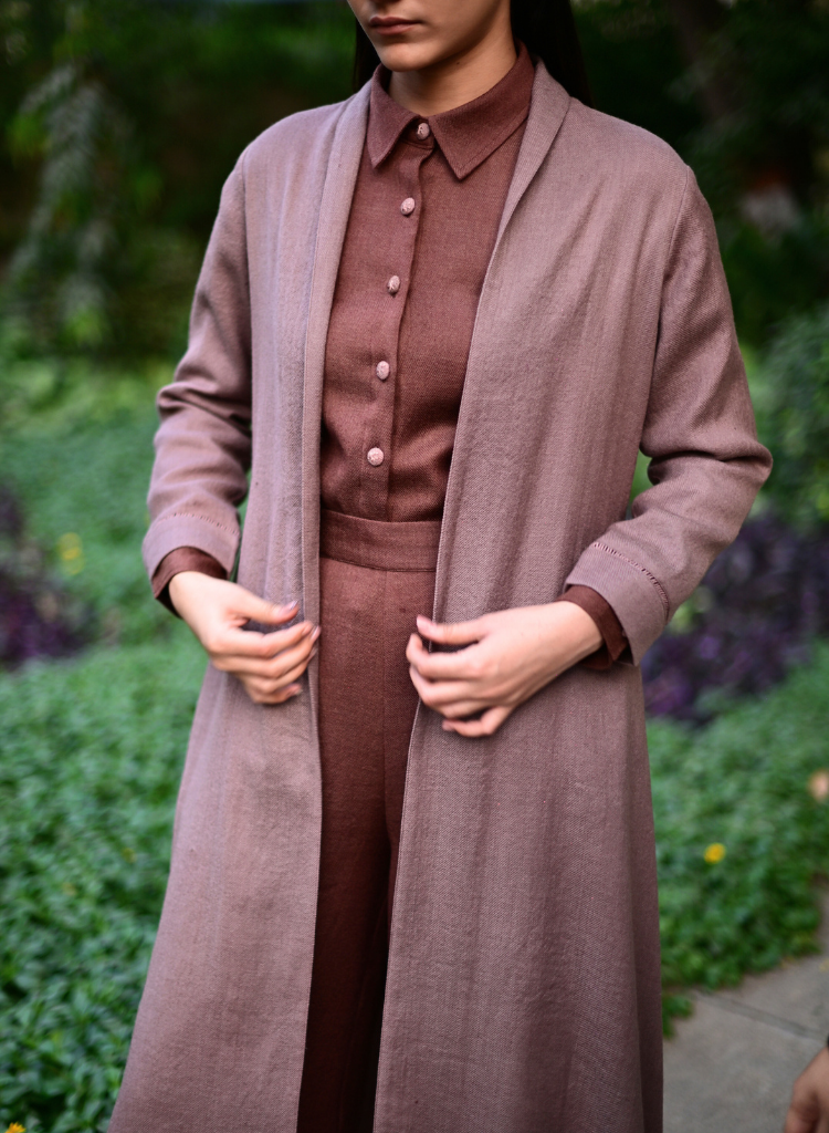 A cozy A-line jacket featuring a lapel collar and faggoting details at the cuff. Length 48". The model is 5'10" and is wearing a size M.
