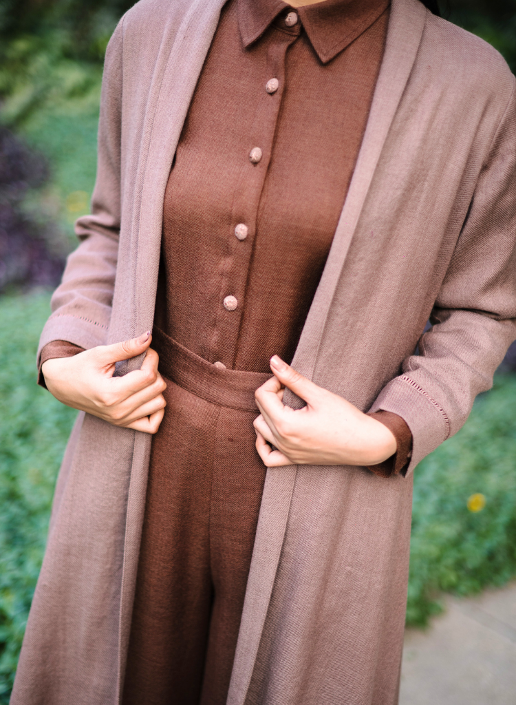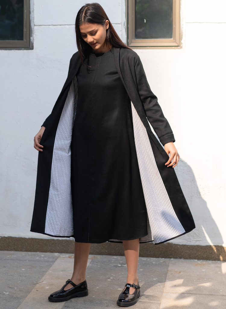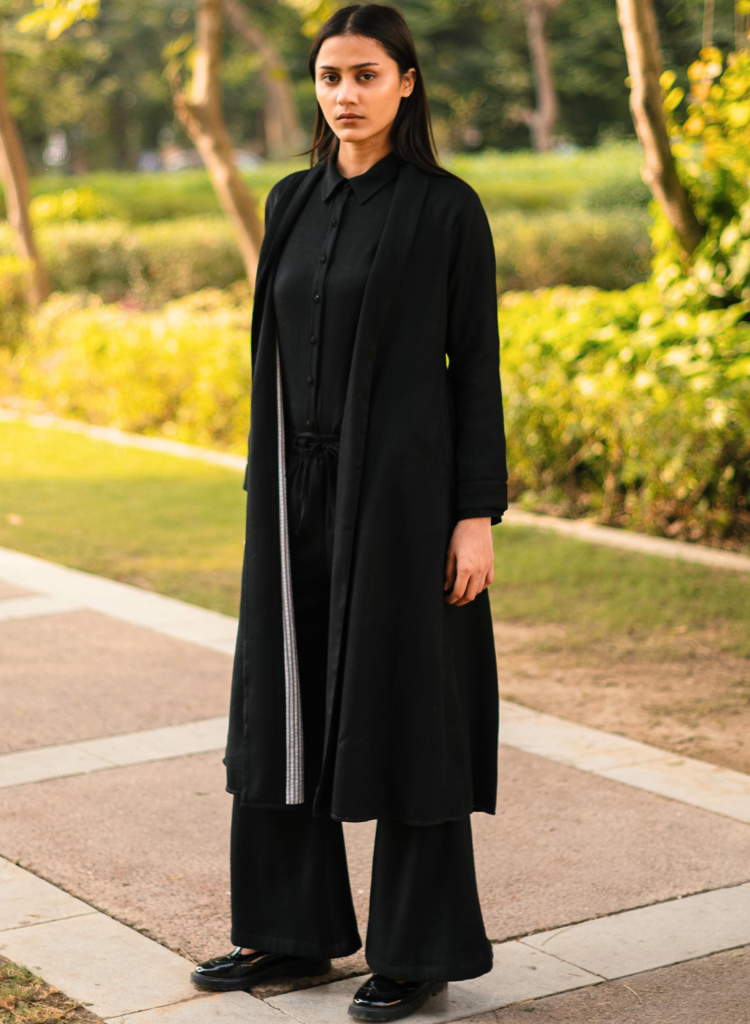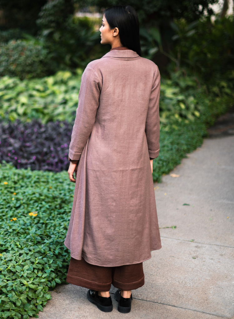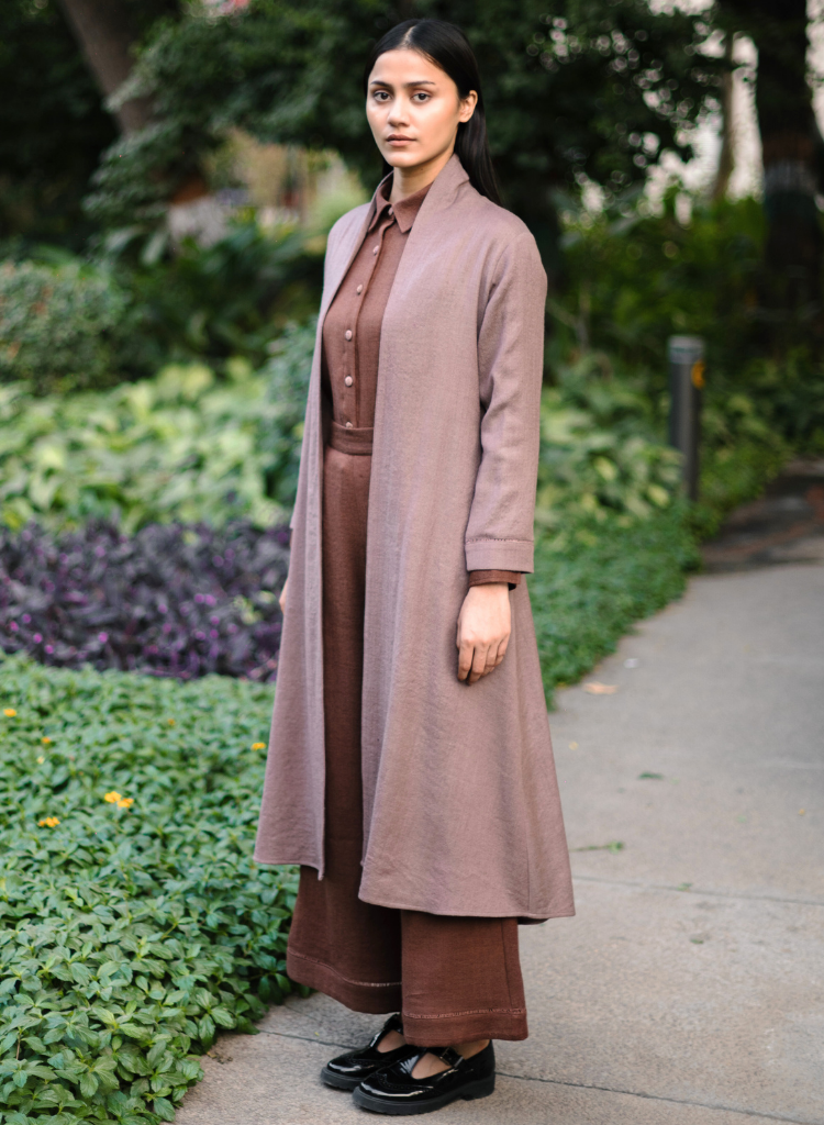 A cozy A-line jacket featuring a lapel collar and faggoting details at the cuff. Length 48". The model is 5'10" and is wearing a size M.