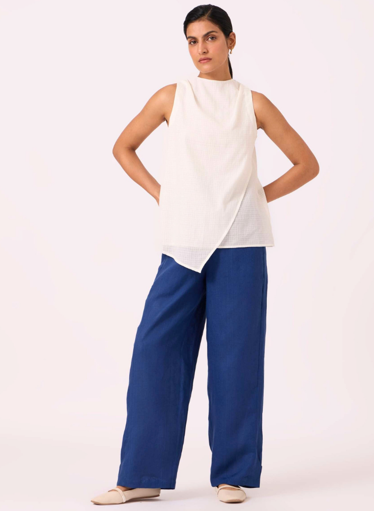 A pair of high waisted pants with an extended bottom hem at ankle featuring zip fly with button fastening and welt pockets. The model is 5'6" and is wearing size XS.