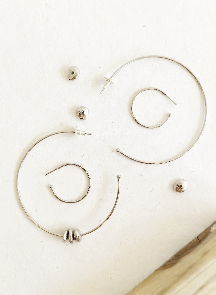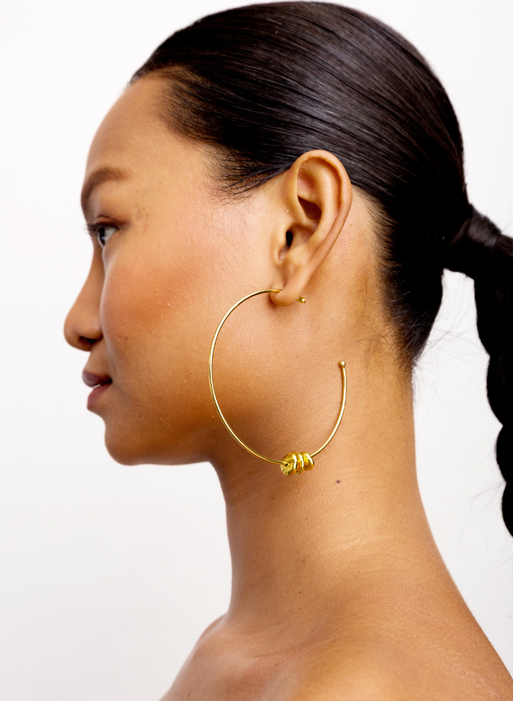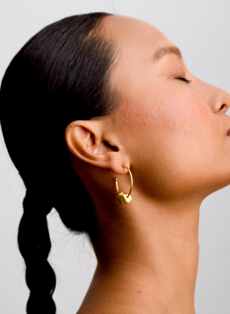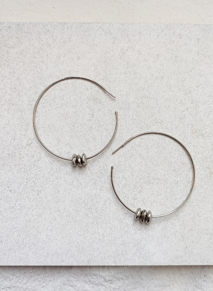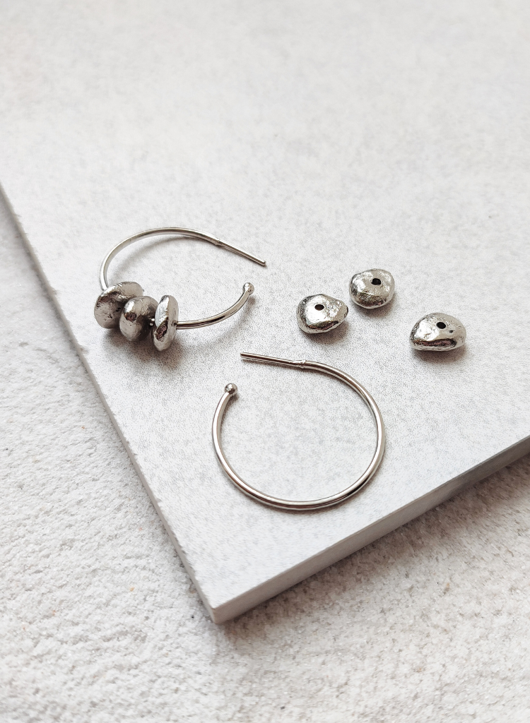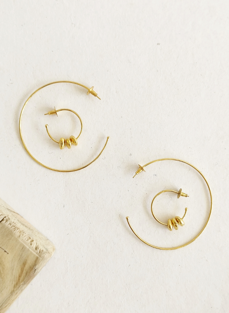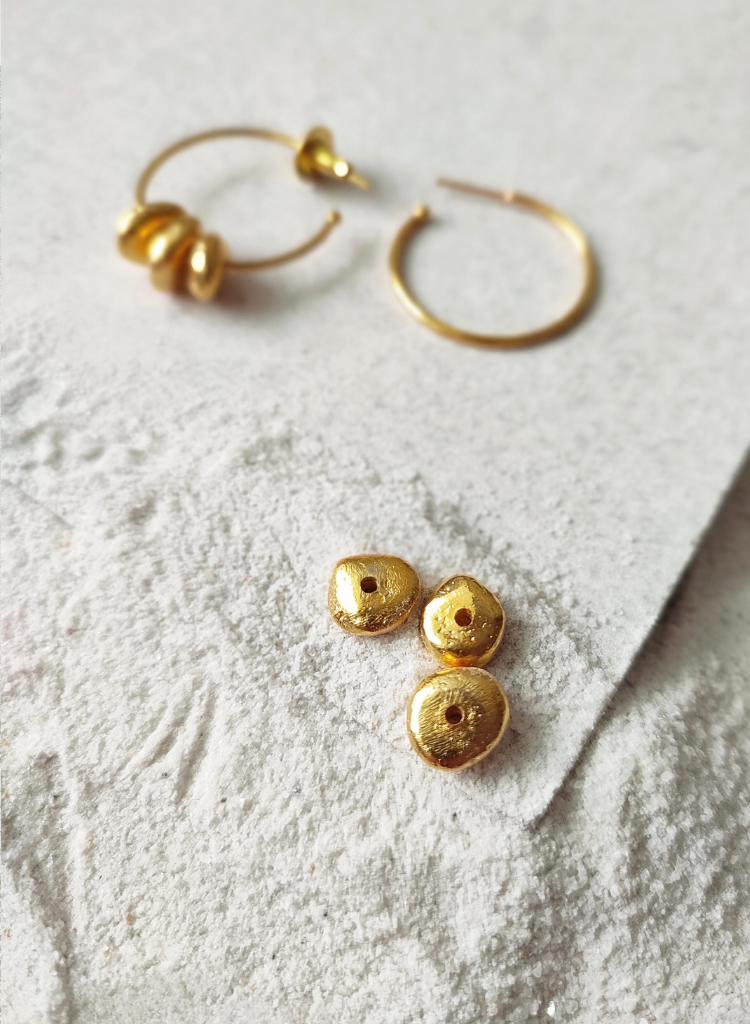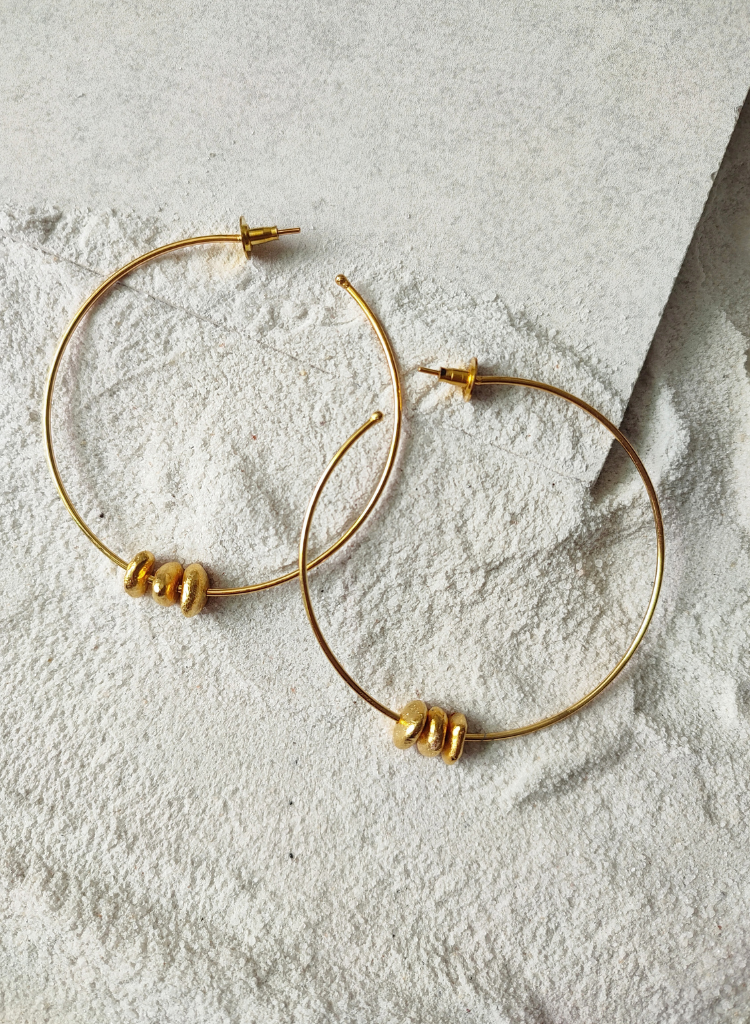 A set of two hoops with asymmetrically textured stones drop detail handcrafted in brass.