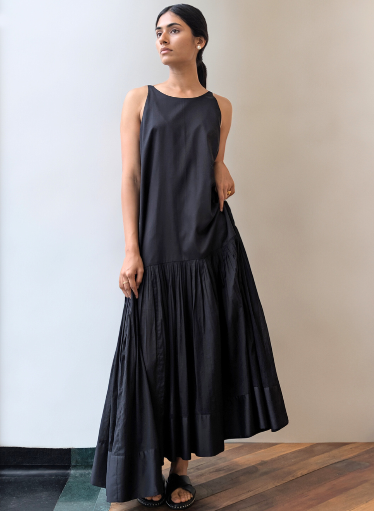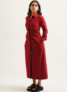 A classic shirt dress with featuring a hidden placket, shirt collar and full sleeves. Adding a little statement pleating detailing on the waist and a tie-up detailing at the back, to achieve the desired fit. Length 48". The model is 5'5" and is wearing size S.