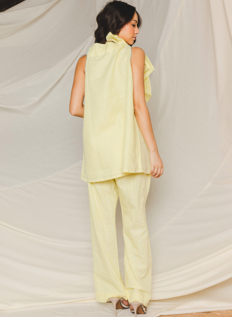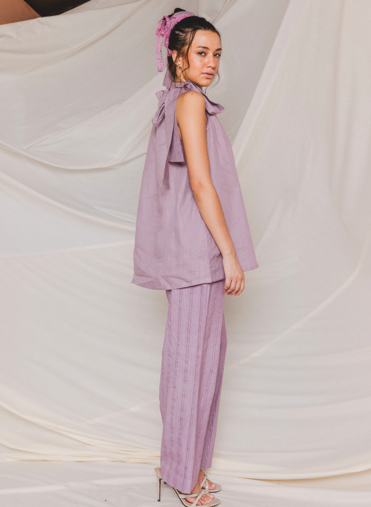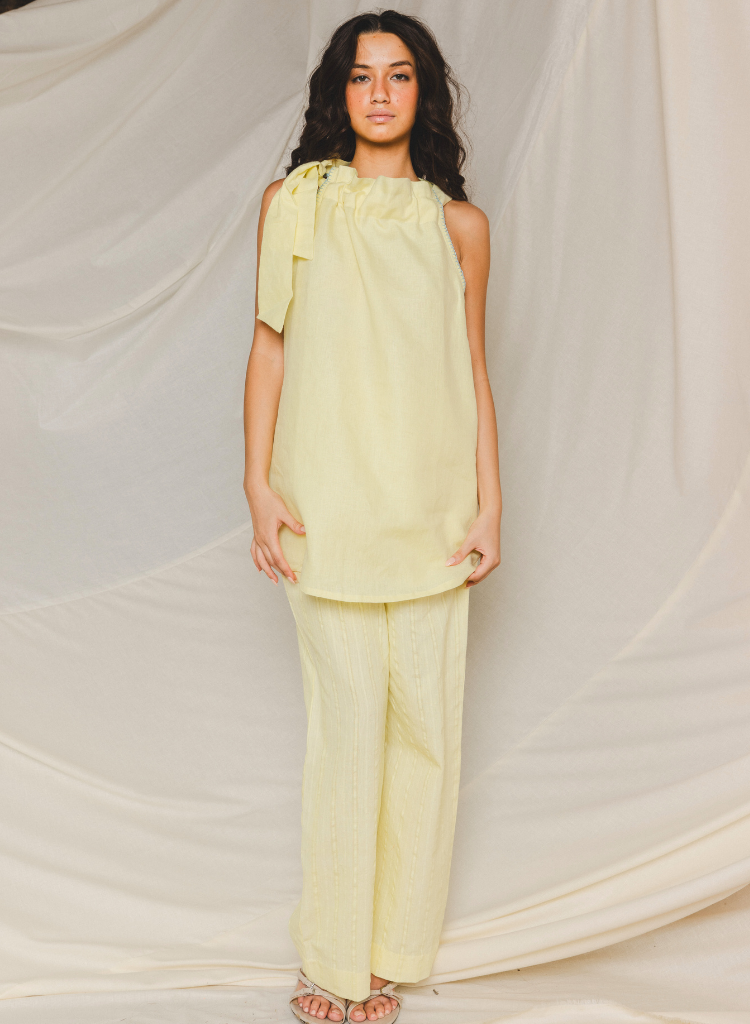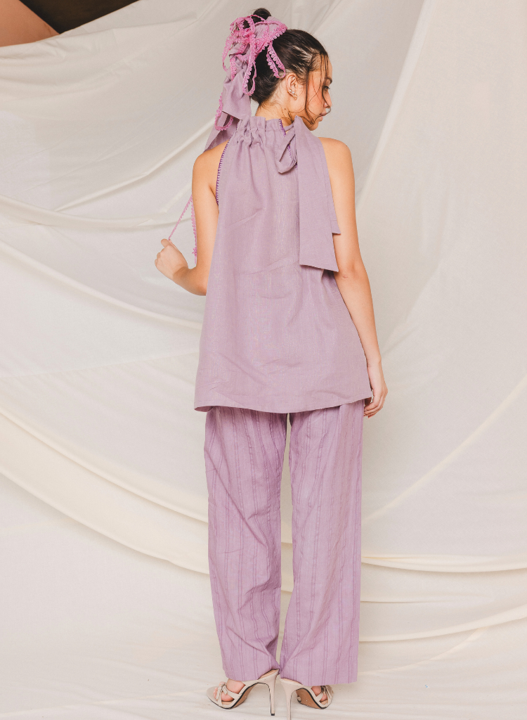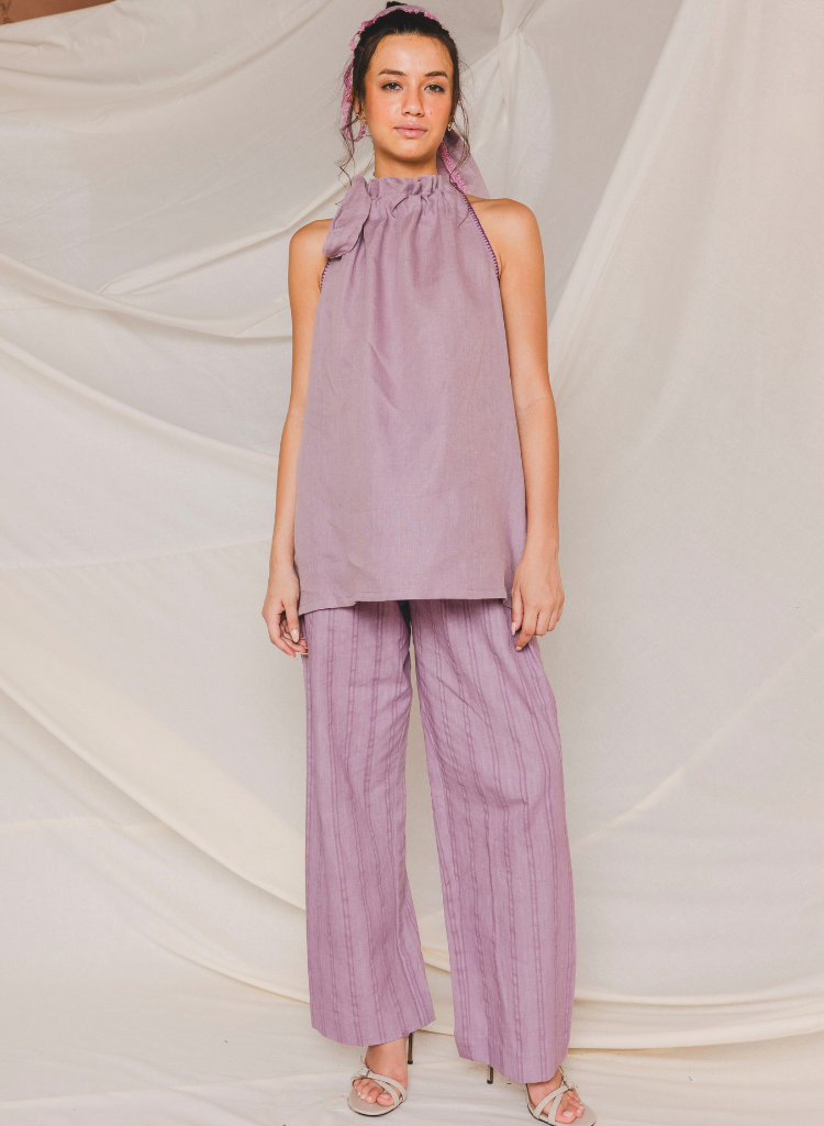 A two-piece set pairing the Alira Halter Neck Top and the Pave Elasticated Pants. The relaxed fitting A-line top with embroidery detail on the armhole features a softly gathered neckline with a halter tie. Length 28". The striped relaxed fitting pants feature a drawstring waist and inseam pockets. Length 40". The model is 5'9” and is wearing size S.