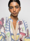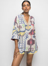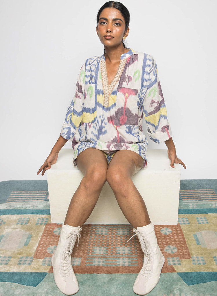 A relaxed fitting slip on top featuring a gathered neck, drop shoulders, a half placket, and big patch pockets. The model is 5'8" and is wearing a size XS.