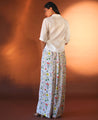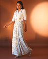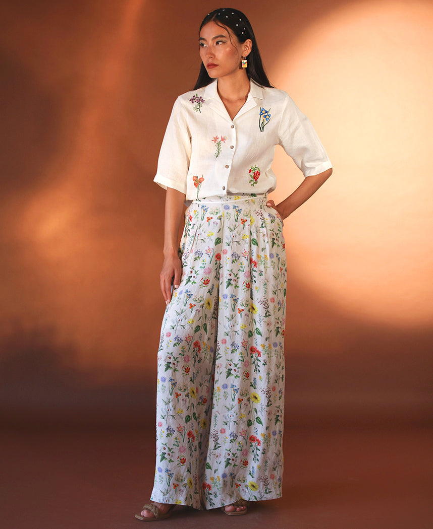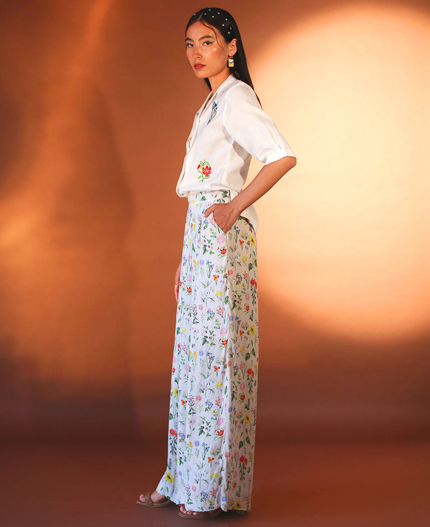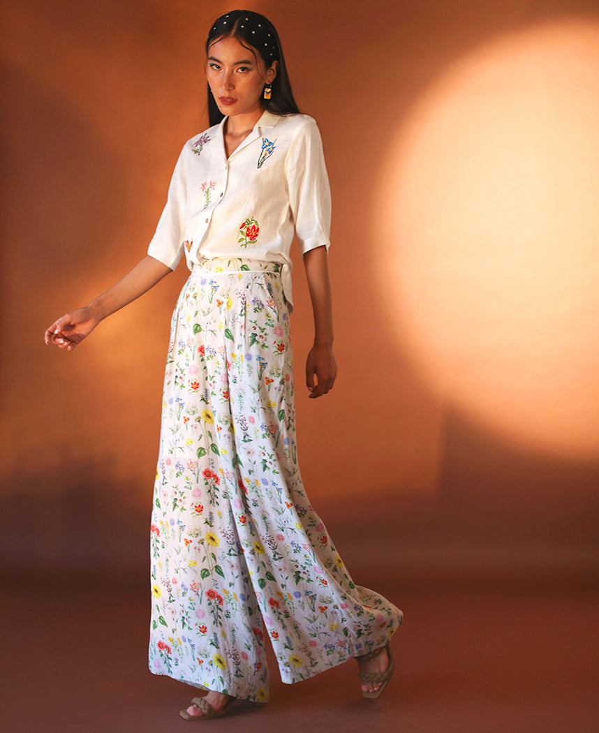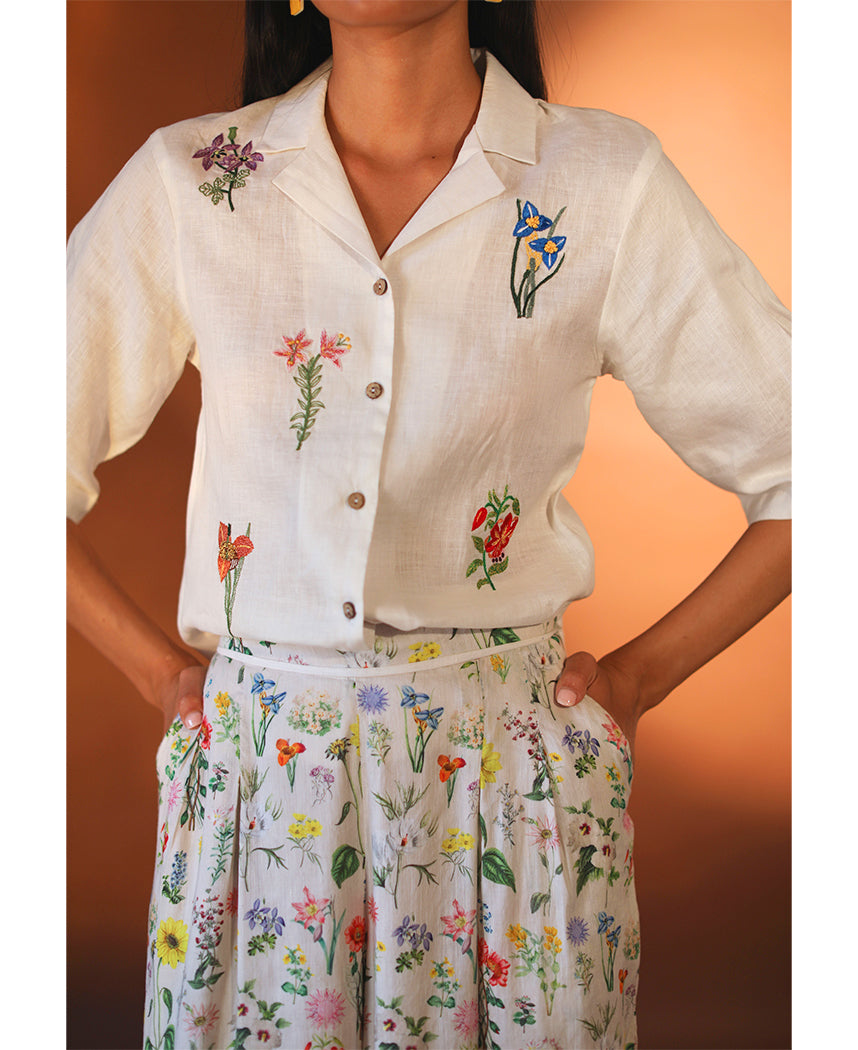 A printed button-down shirt with hand-embroidered botanical motifs featuring a classic collar, pleated sleeves and a front button placket. Length 24". The model is 5'8" and is wearing size XS.