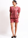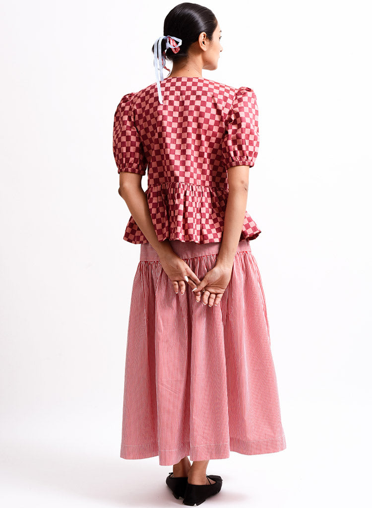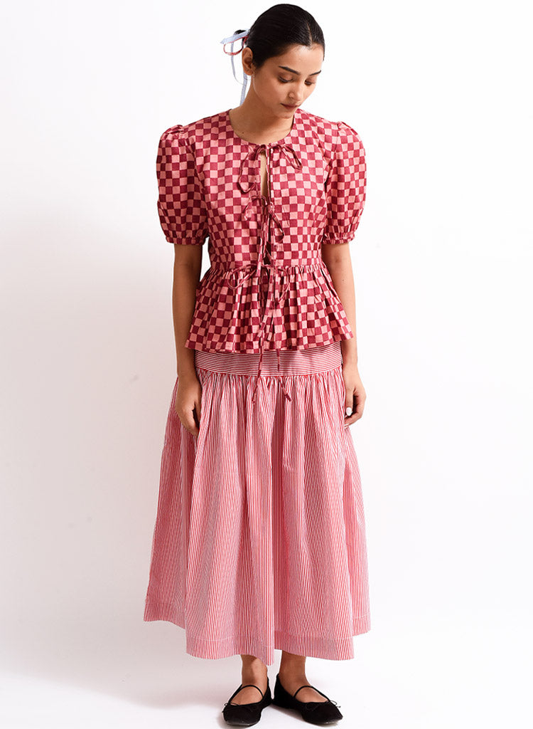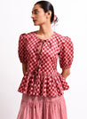 A checkered top with tie up details at the front and a frilled hem featuring a round neck and puff sleeves. Length 22". The model is 5’4 and is wearing a size XS.