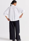 A relaxed-fitting shirt with a front button-down opening, box pleat detail at the back and small side slits featuring flap patch pockets and 3/4 relaxed sleeves. Length 25". The model is 5'7" & is wearing size S.