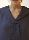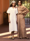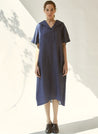 A relaxed fitting midi dress featuring a button-up front , flared sleeves and a Japanese collar. Length 45". The model is 5'8" and is wearing a size S.