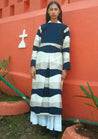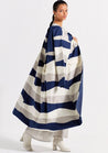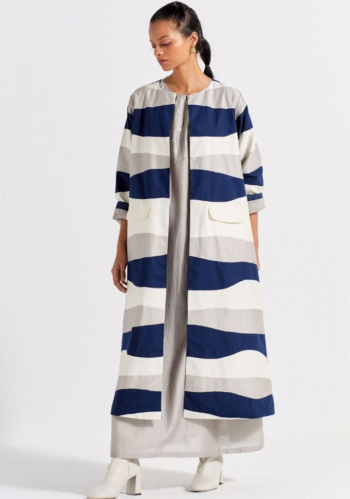 A long jacket with appliqué detail all-over, solid back yoke and an inverted pleat at the centre back featuring a round neck, centre front opening and flap pockets. Length 48". The model is 5'7" & is wearing size S.